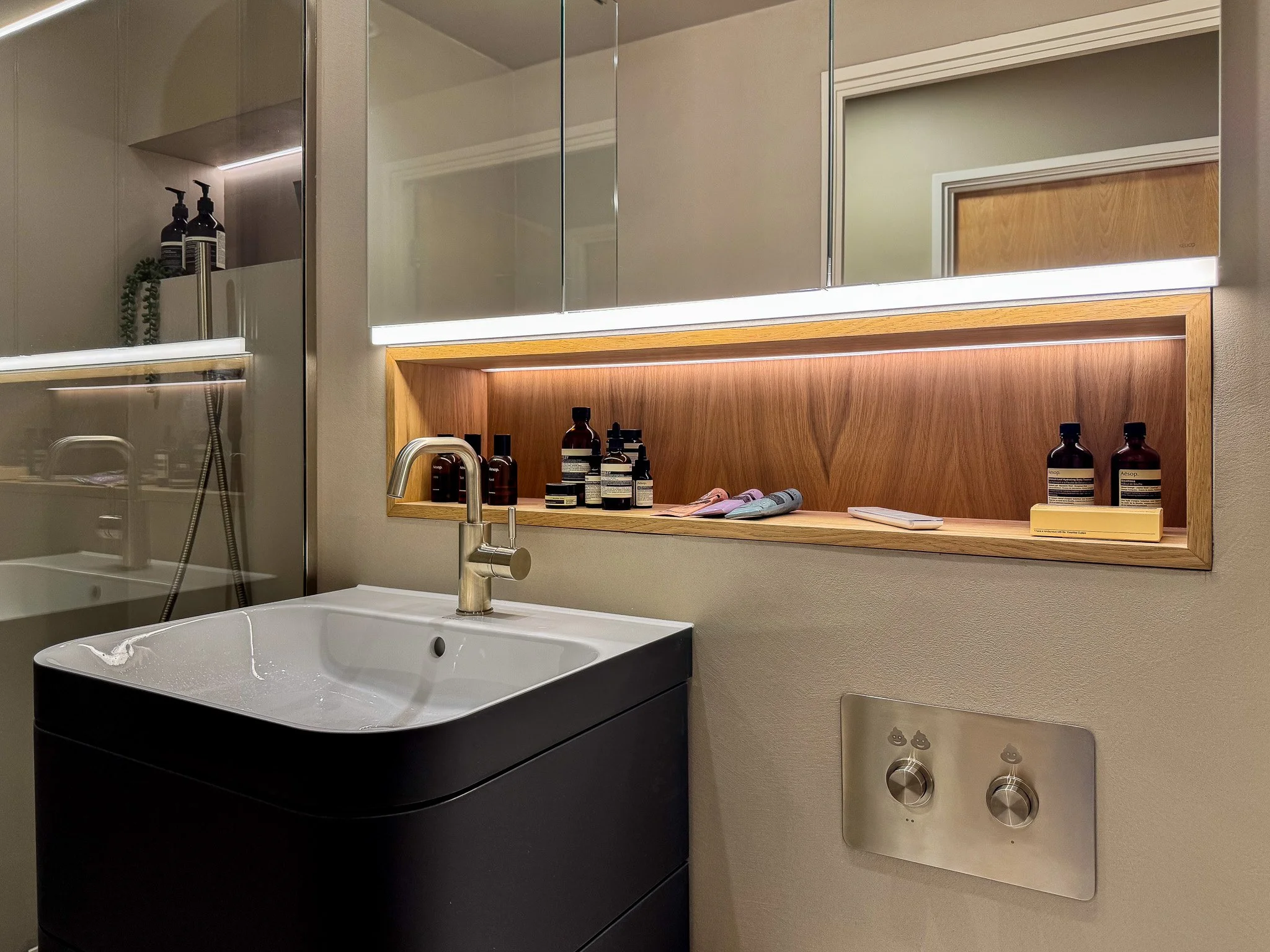 Microcement bathrooms suit clients who want a calm, spa-like feel with fewer grout lines and a softer, continuous surface. We use trusted European microcement systems with excellent resistance to moisture and wear, and every surface is hand-finished in our workshop for precision and consistency. Microcement can wrap walls, floors, niches, and even bathroom furniture, creating a cohesive, modern finish that still feels warm. Tile can then be used strategically for feature zones, or avoided entirely where seamlessness is the priority.Fixtures, Fitting, And Storage Make Everyday Use Feel Effortless
