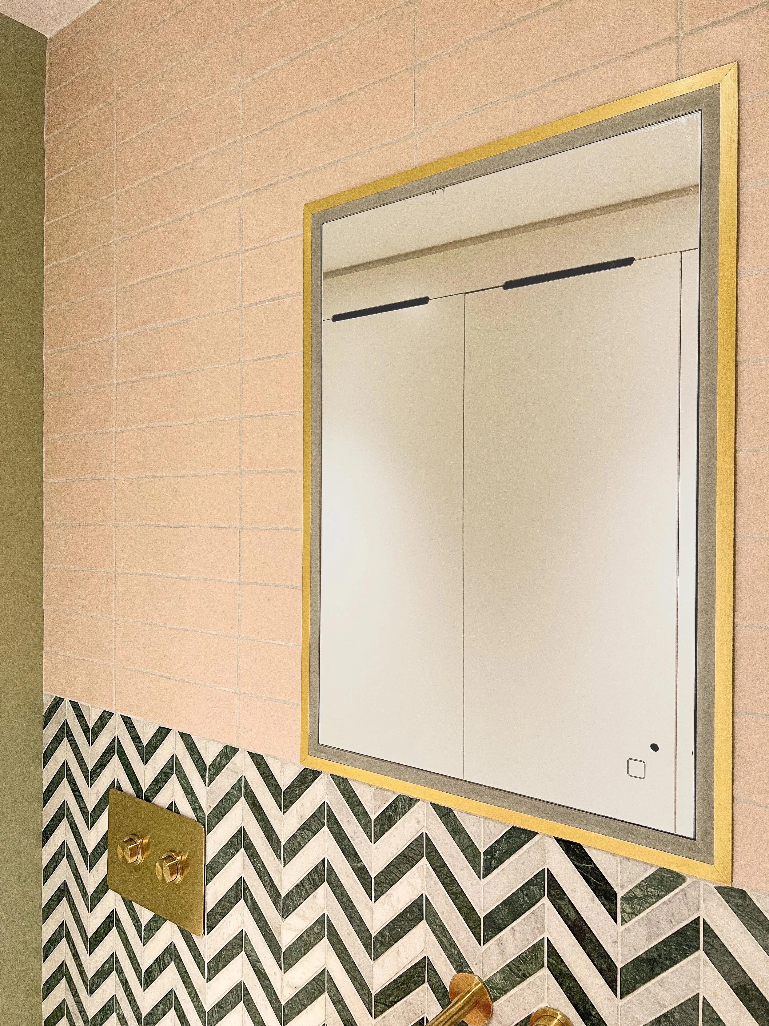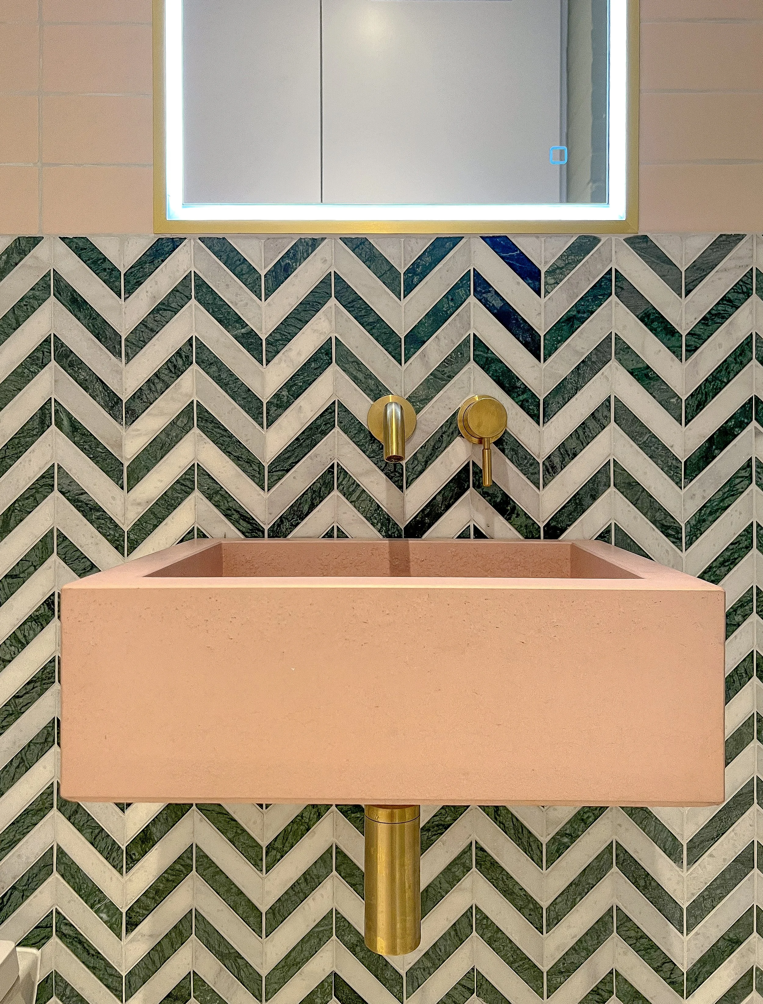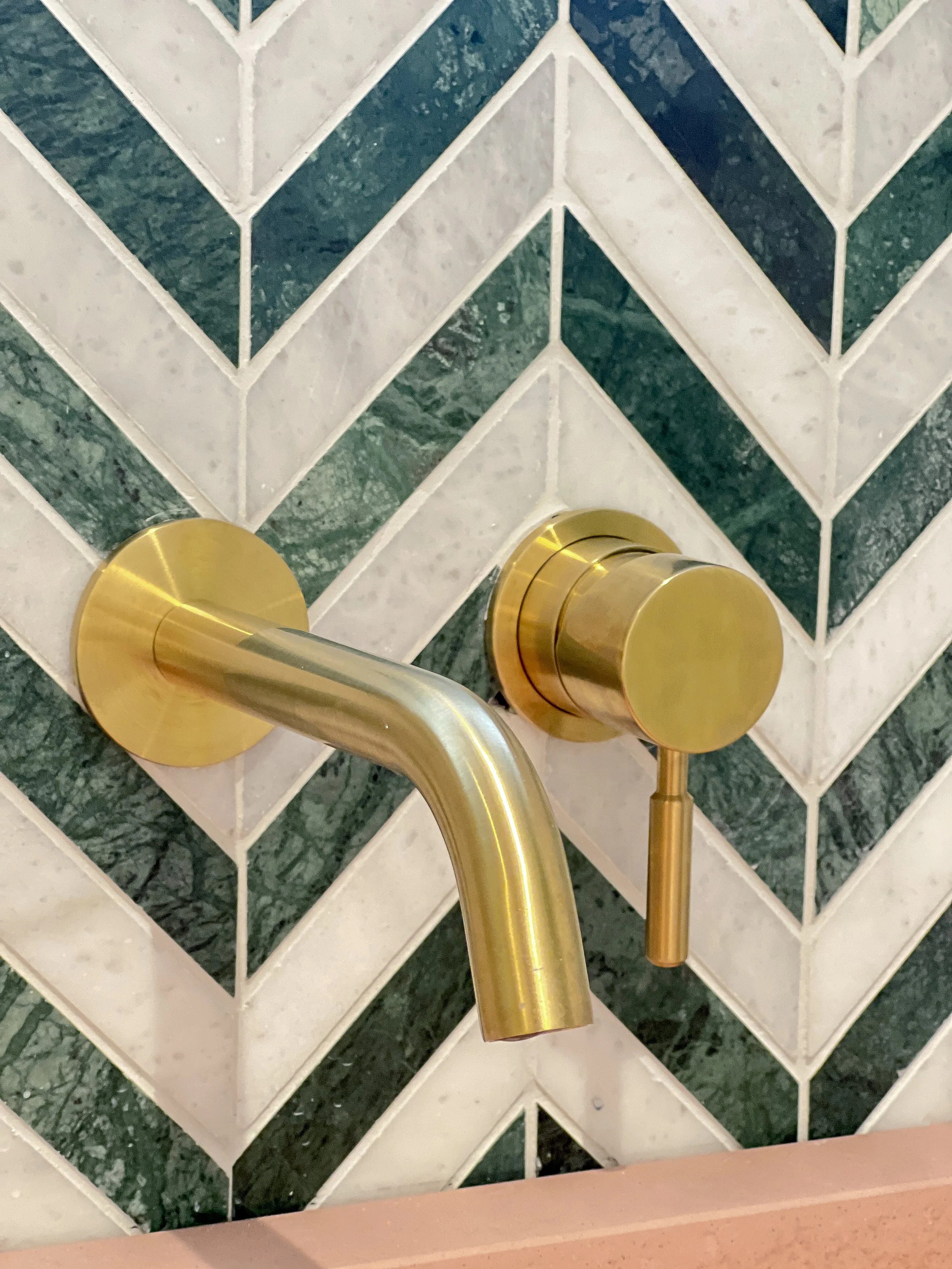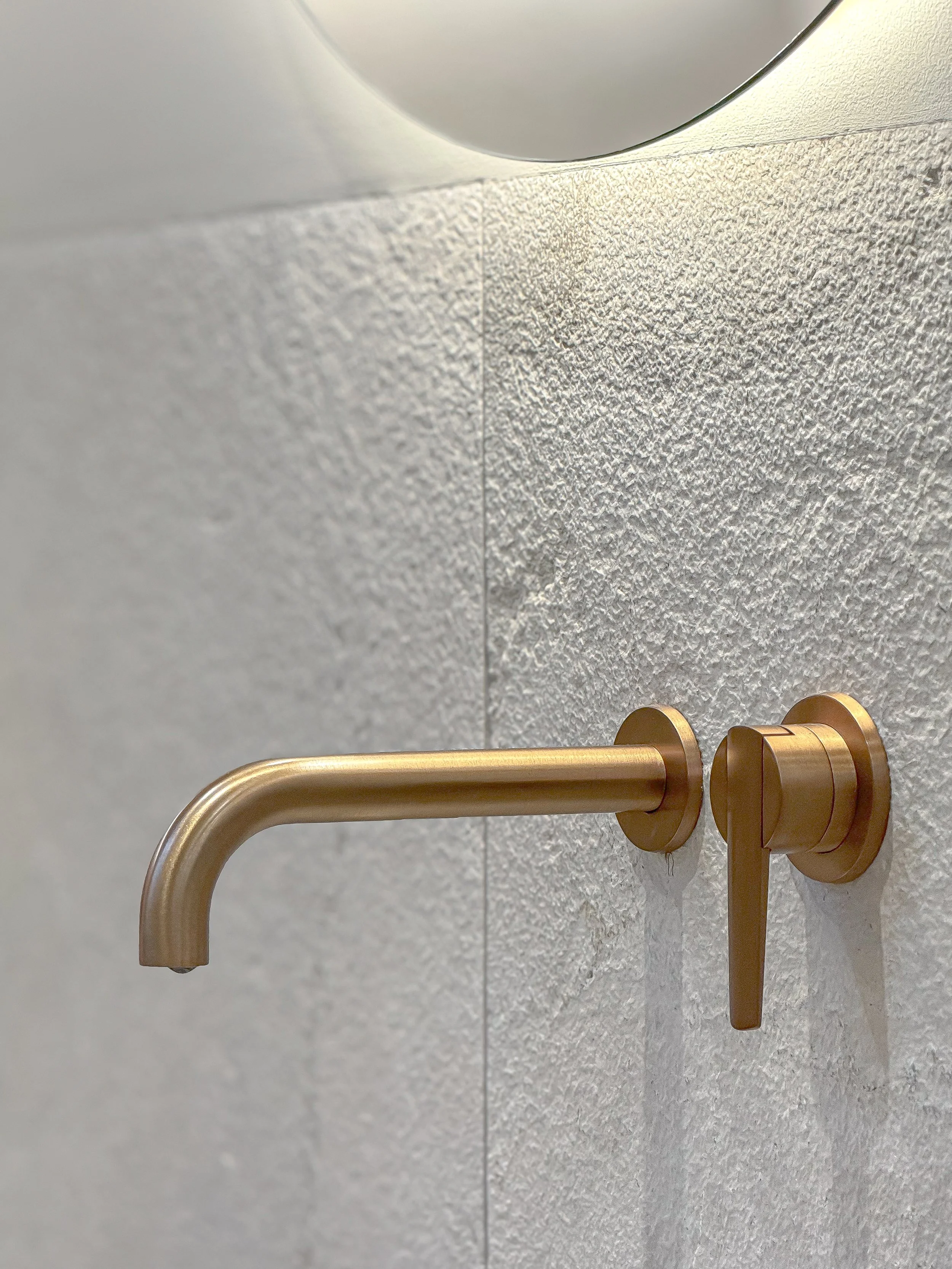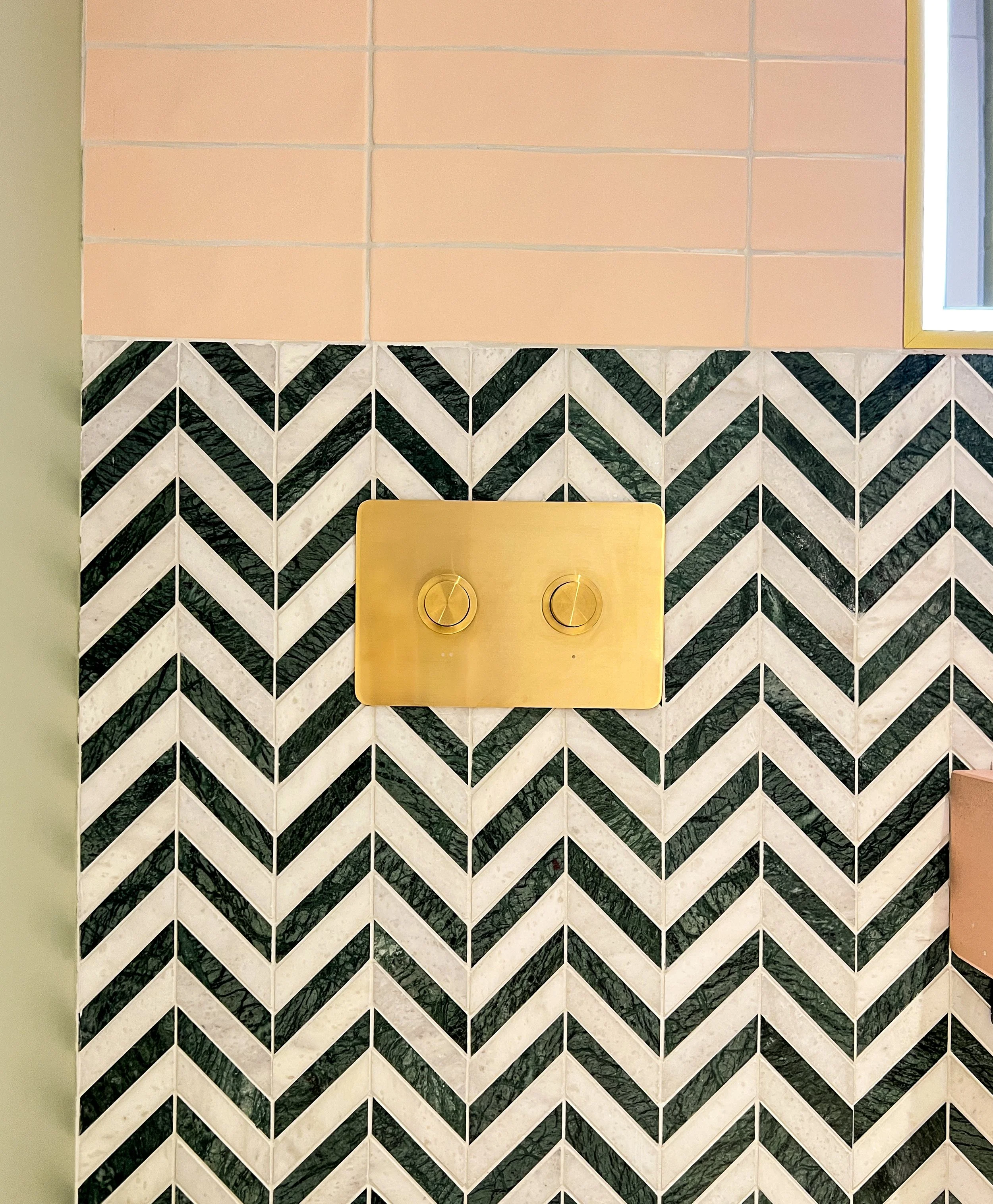 The natural beauty of the limestone tiles, with their intricate parquet pattern, adds texture and visual interest to the room while providing a sense of warmth and luxury. The bronze tones complement the earthy hues of the limestone, creating a stylish sanctuary.