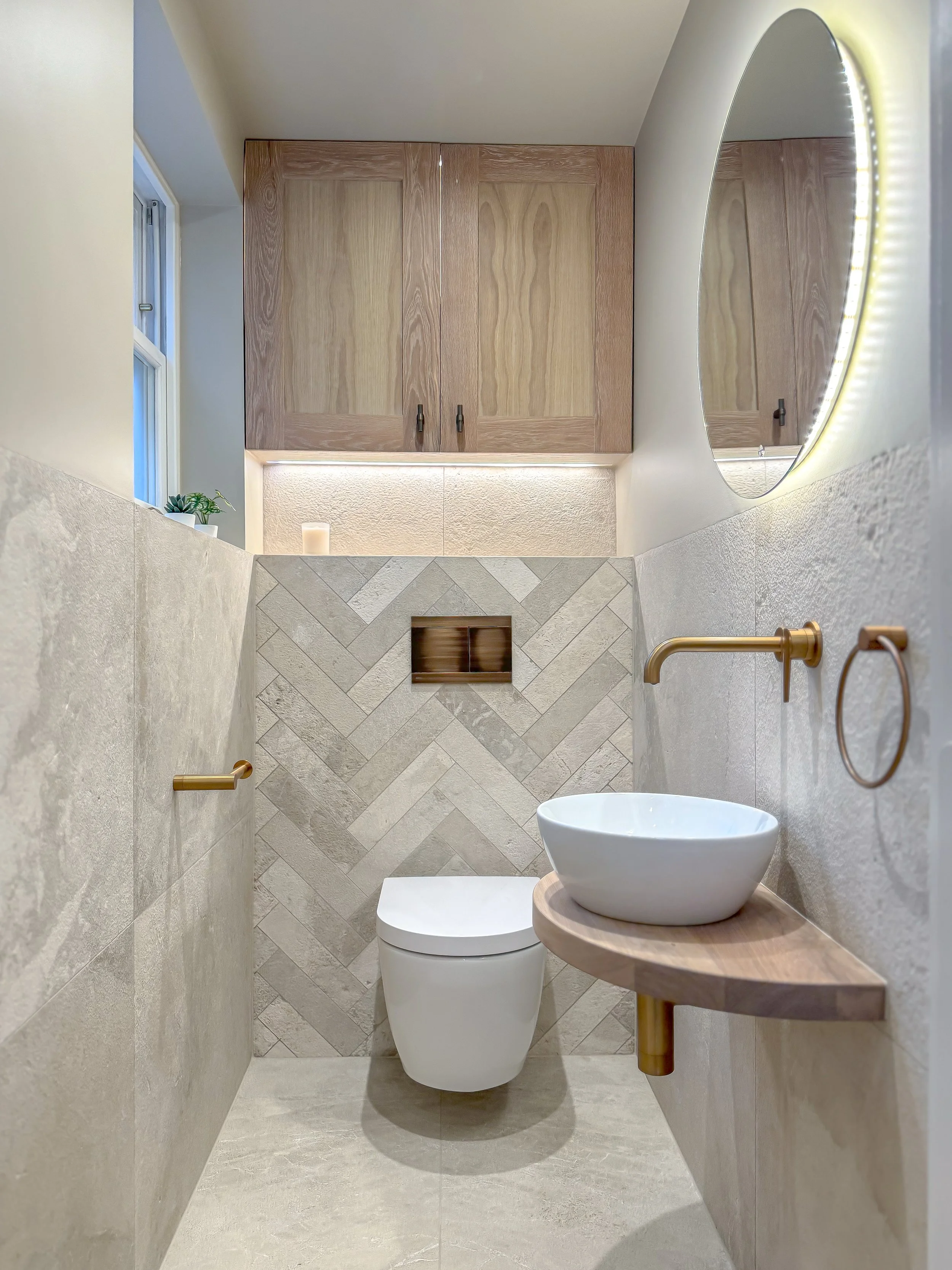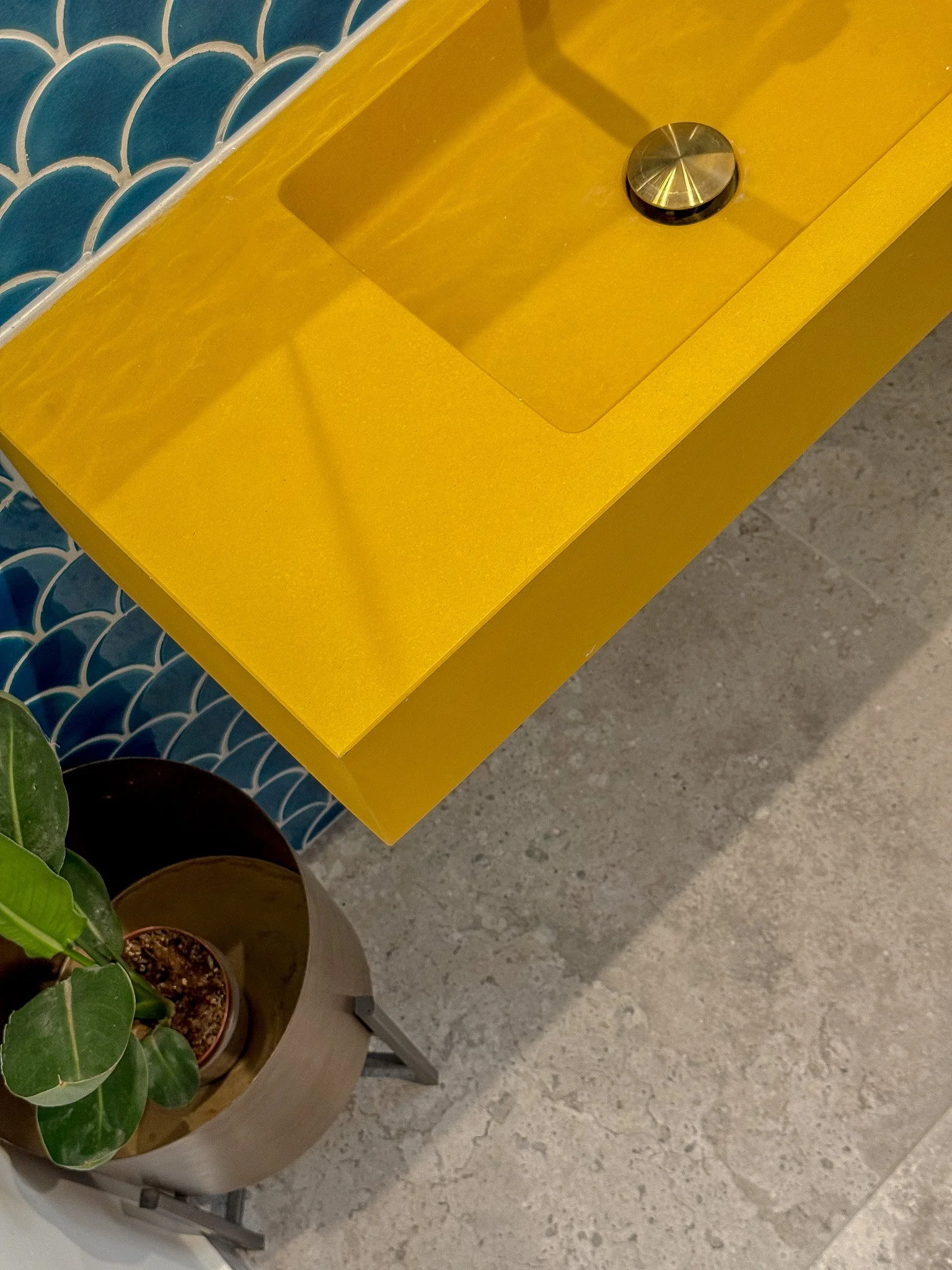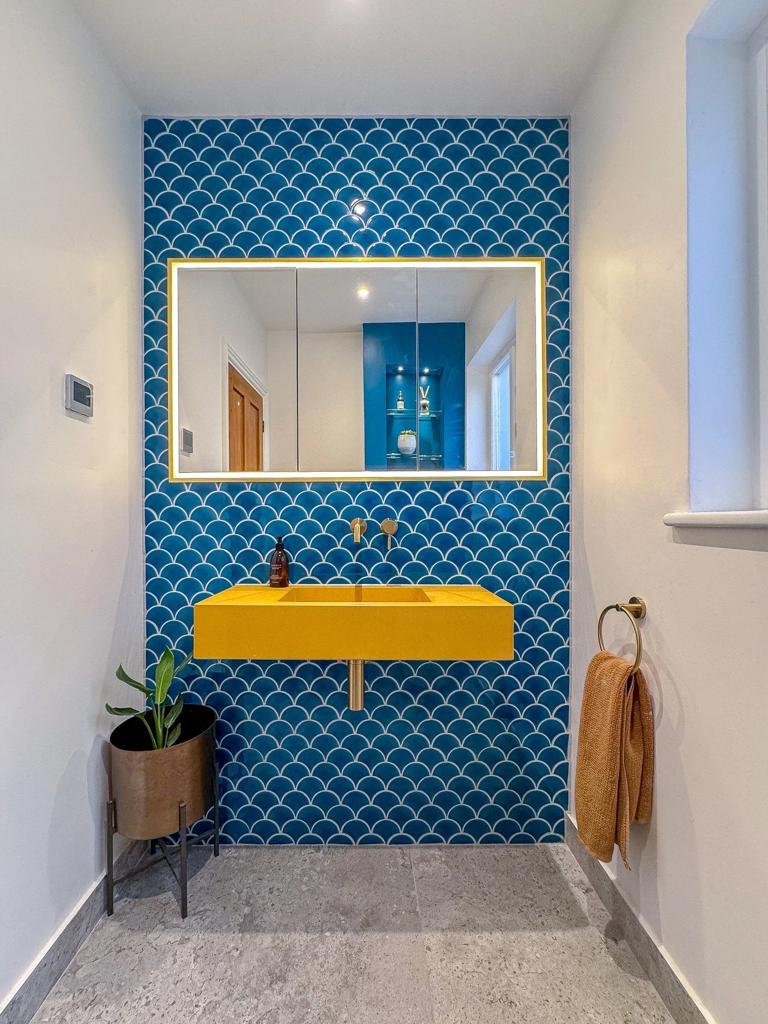 A cloakroom full of personality with a feature wall of blue scallop tiles as well as a stunning yellow concrete basin with brushed brass accessories, offers a wonderful focal point in the room - making it both functional, fun and striking.