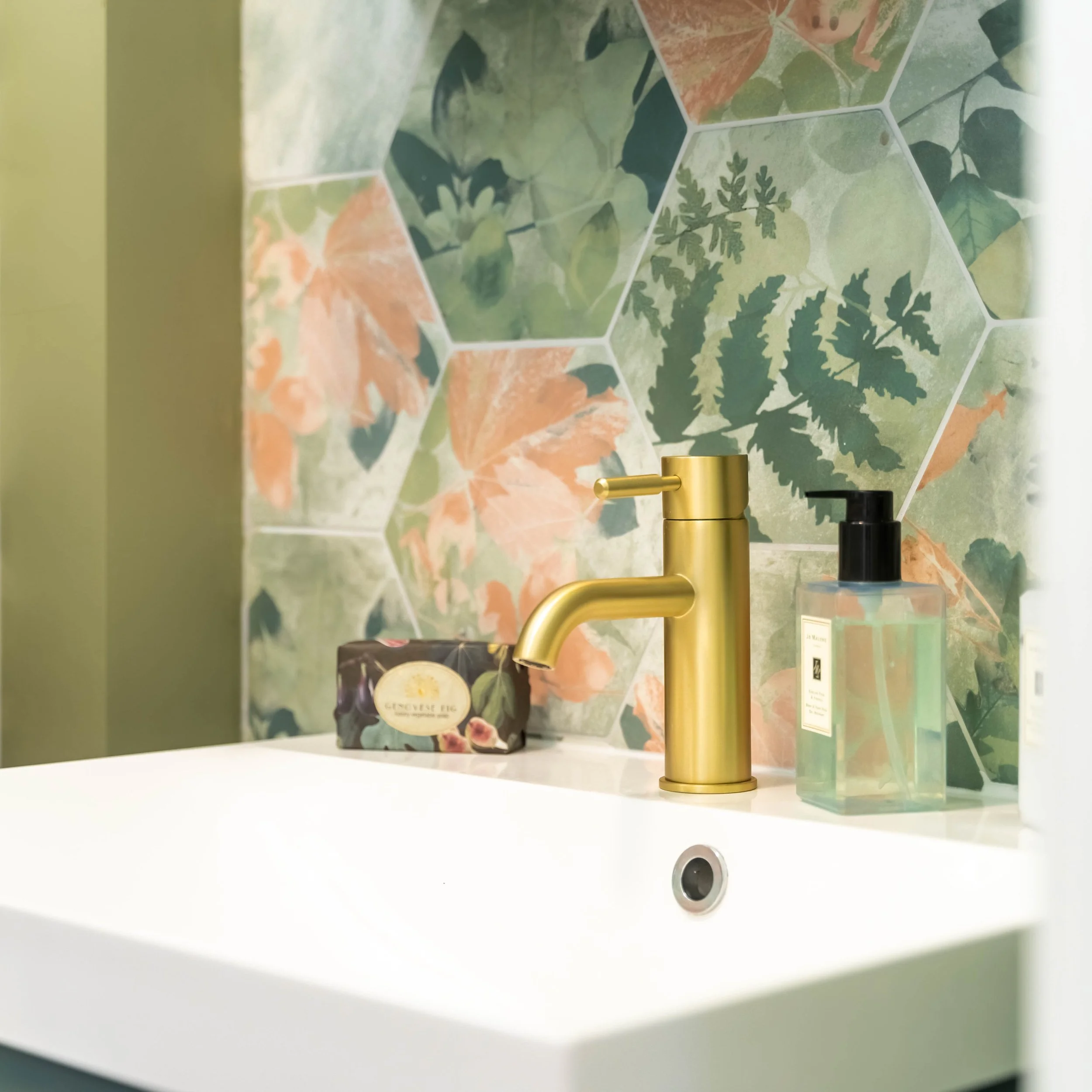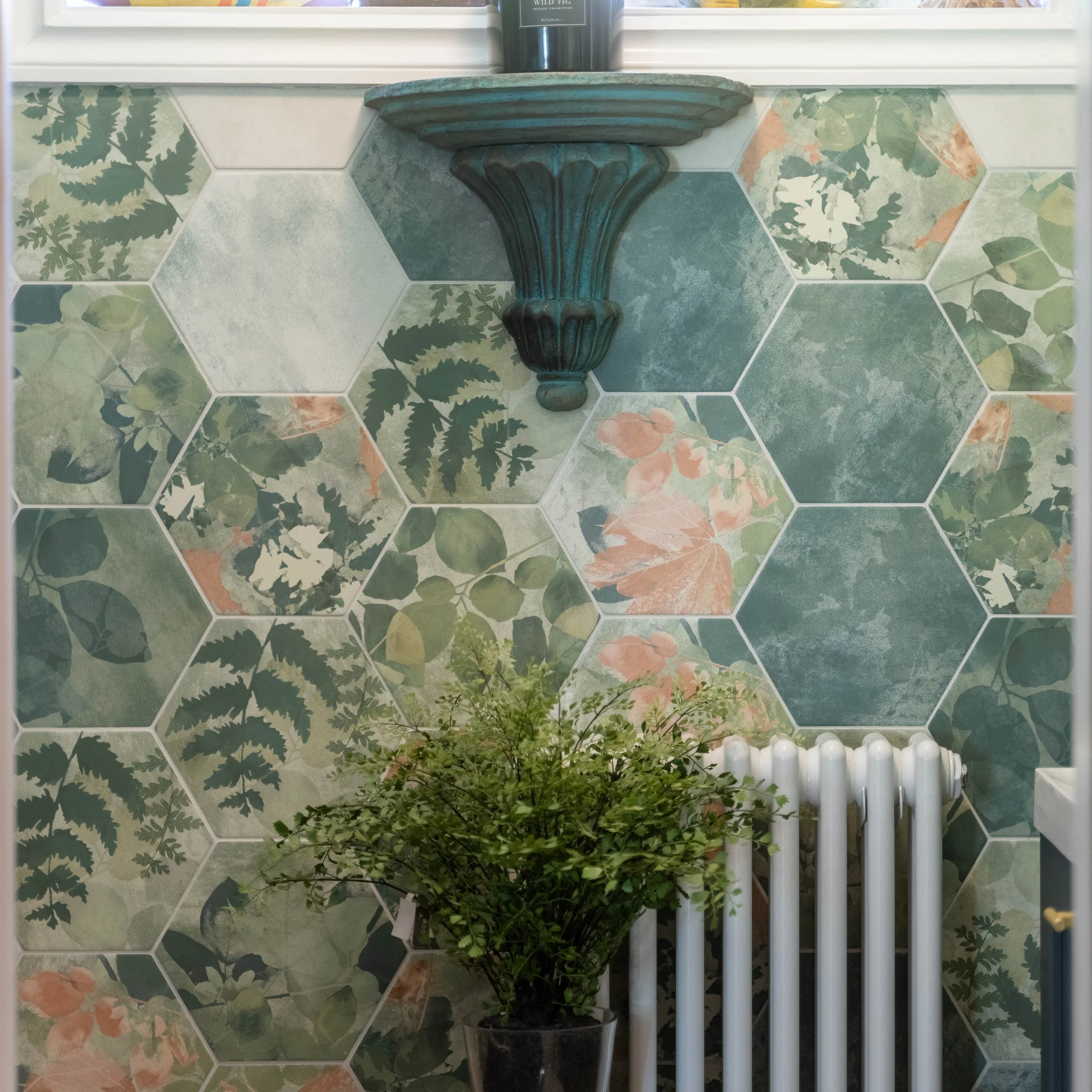The Woodland Glade collection features an exquisite array of botanical printed tiles, boasting an on-trend hexagonal design. It adds a touch of luxury with brushed brass accessories, enhancing its appeal.