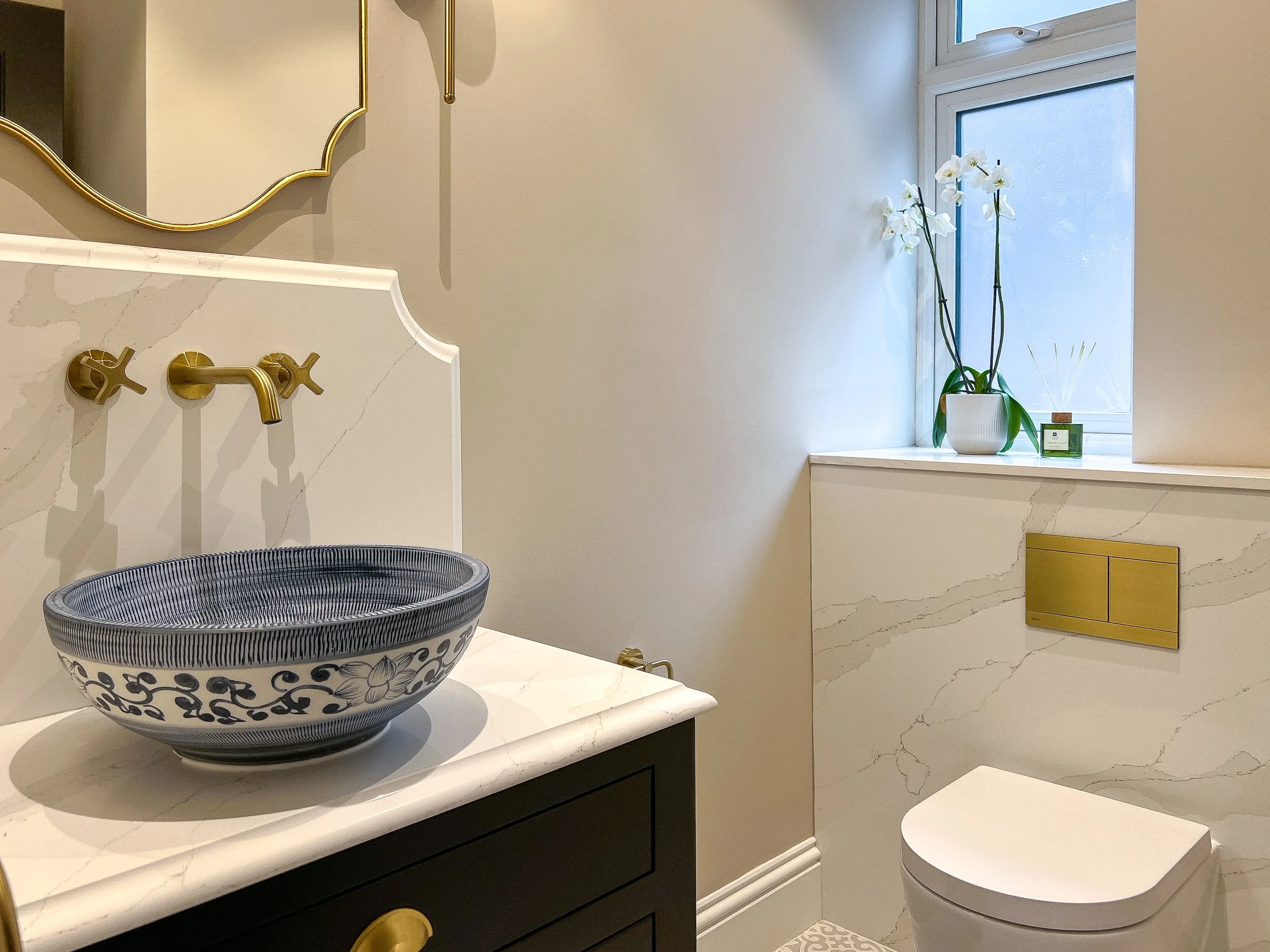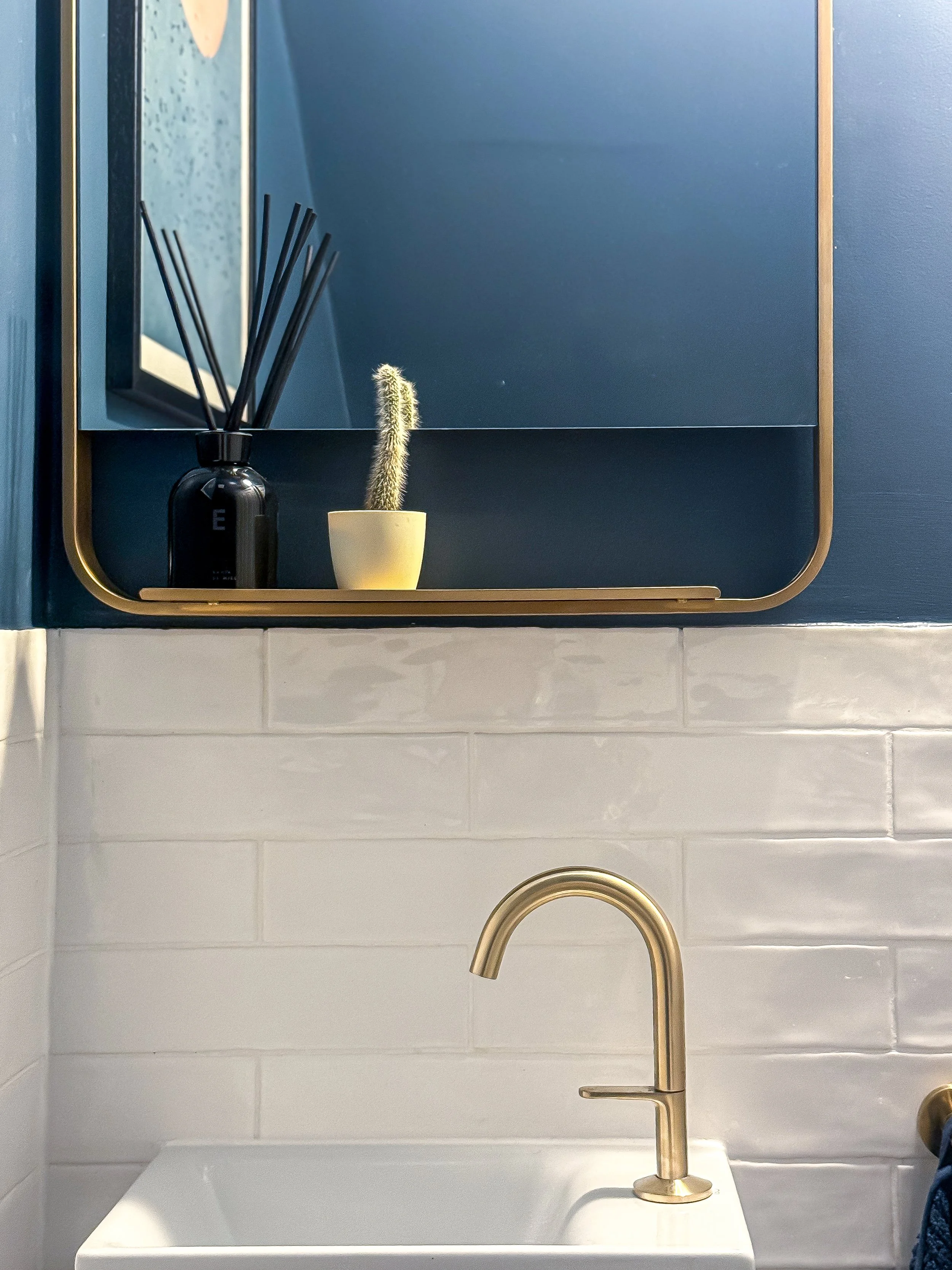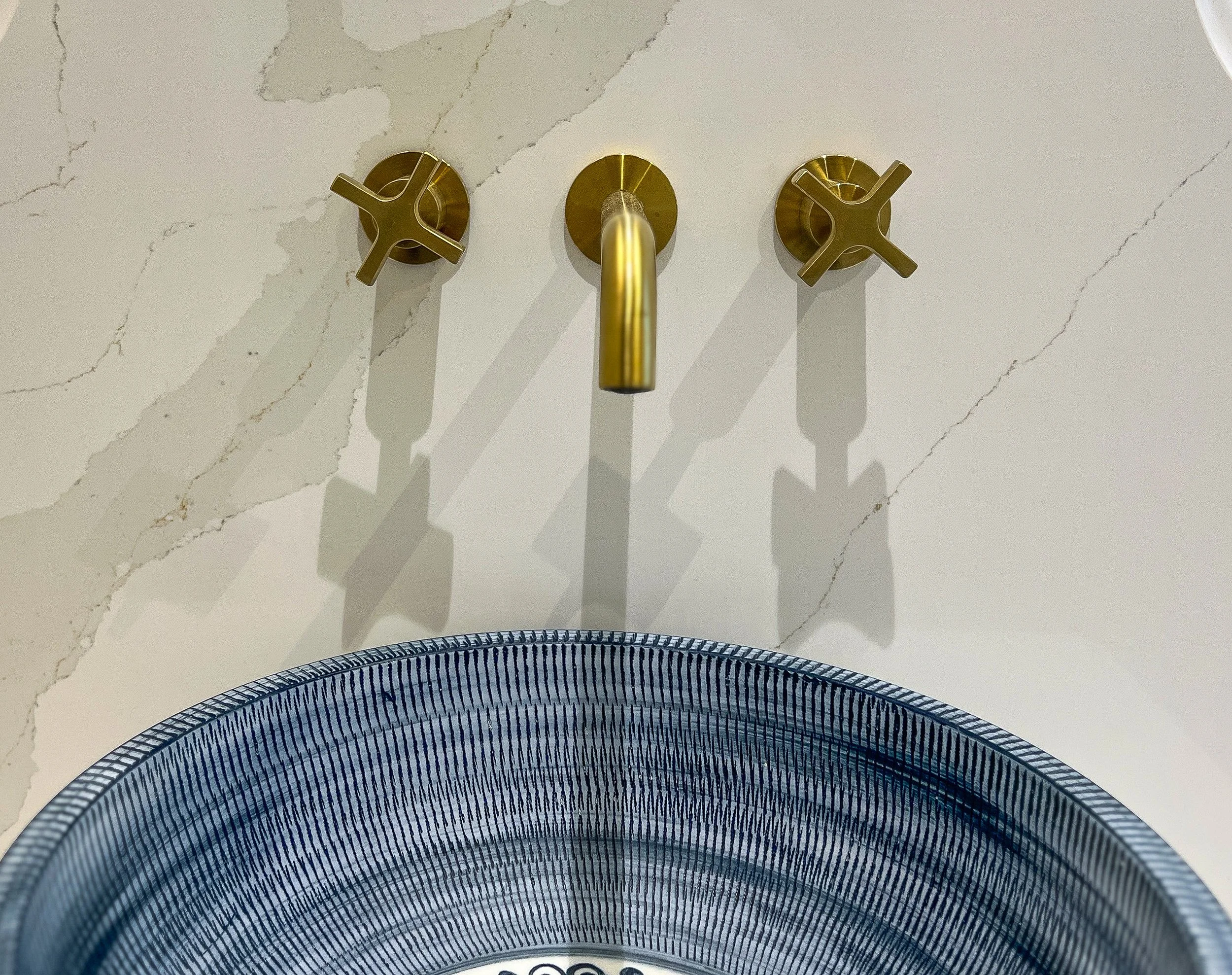 The combination of white and blue evokes a sense of serenity and freshness. Brushed brass brassware complements the coolness of the blue and white palette, adding a touch of luxury and warmth to the overall ambience.