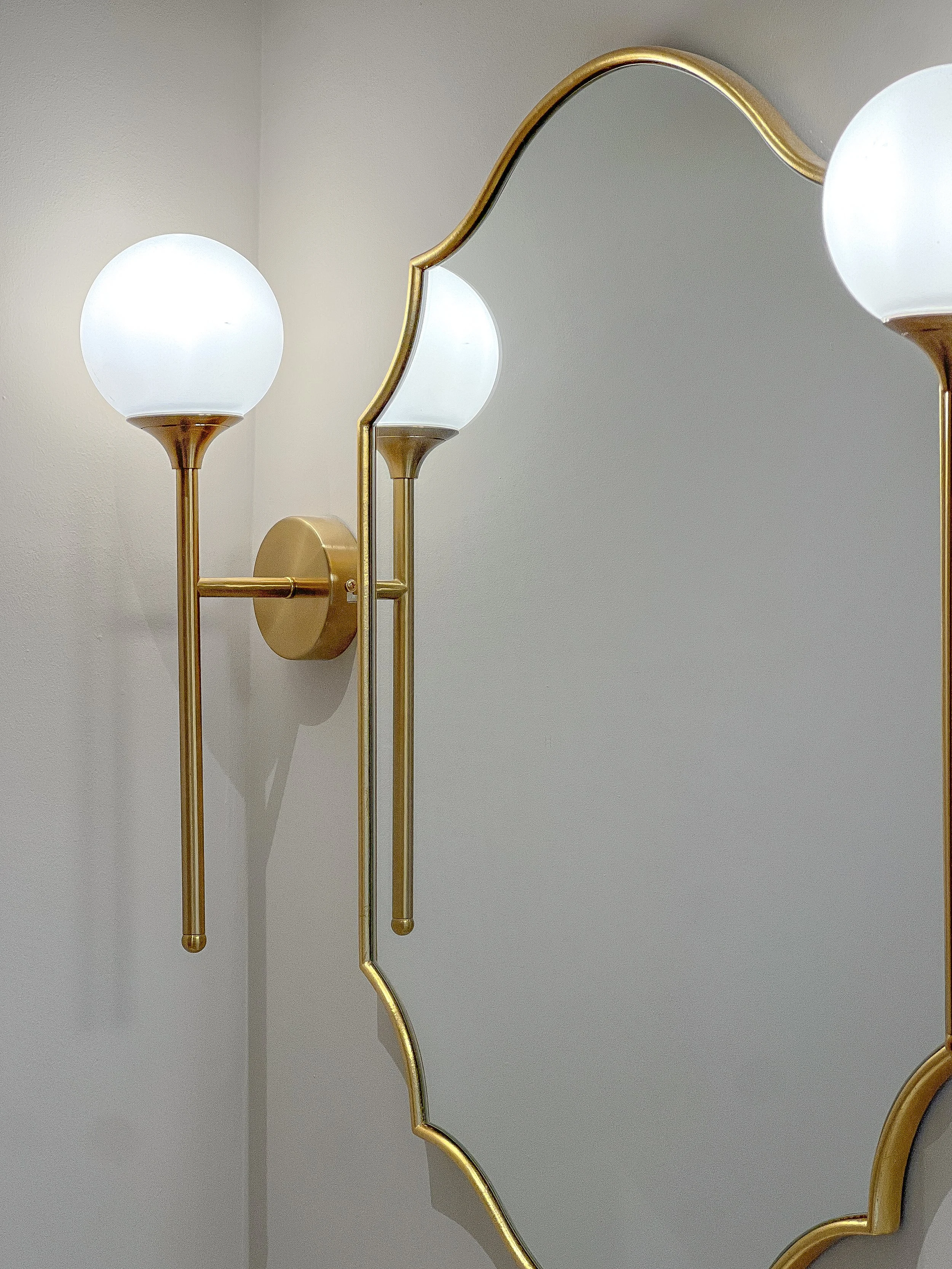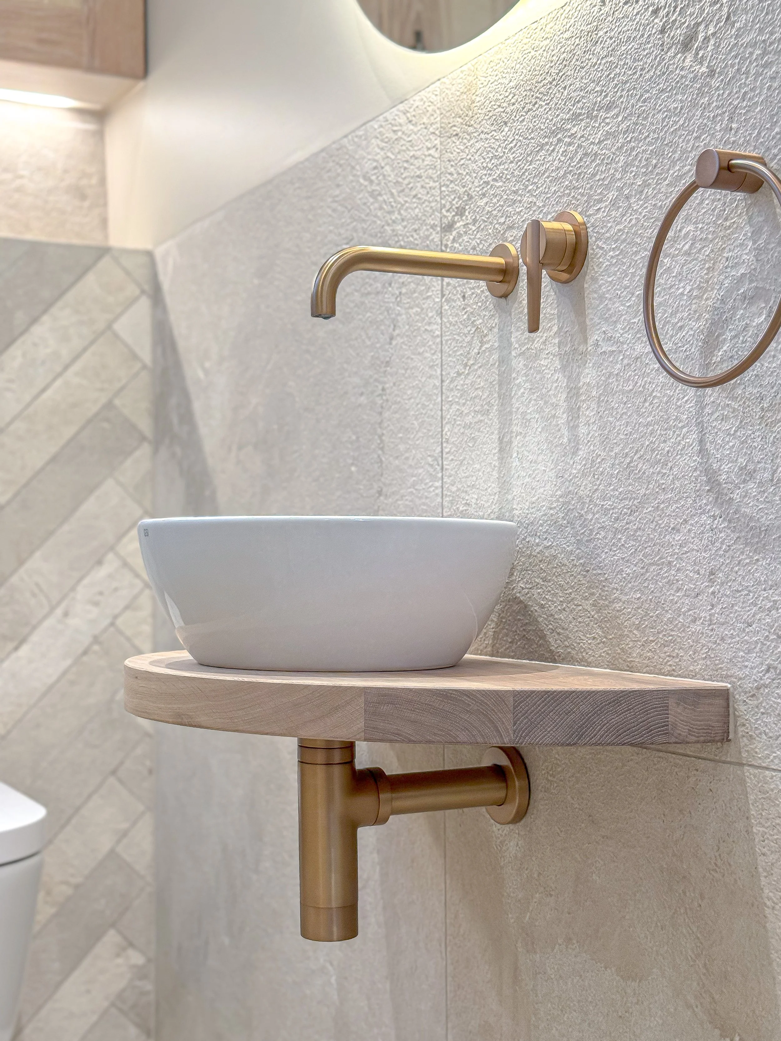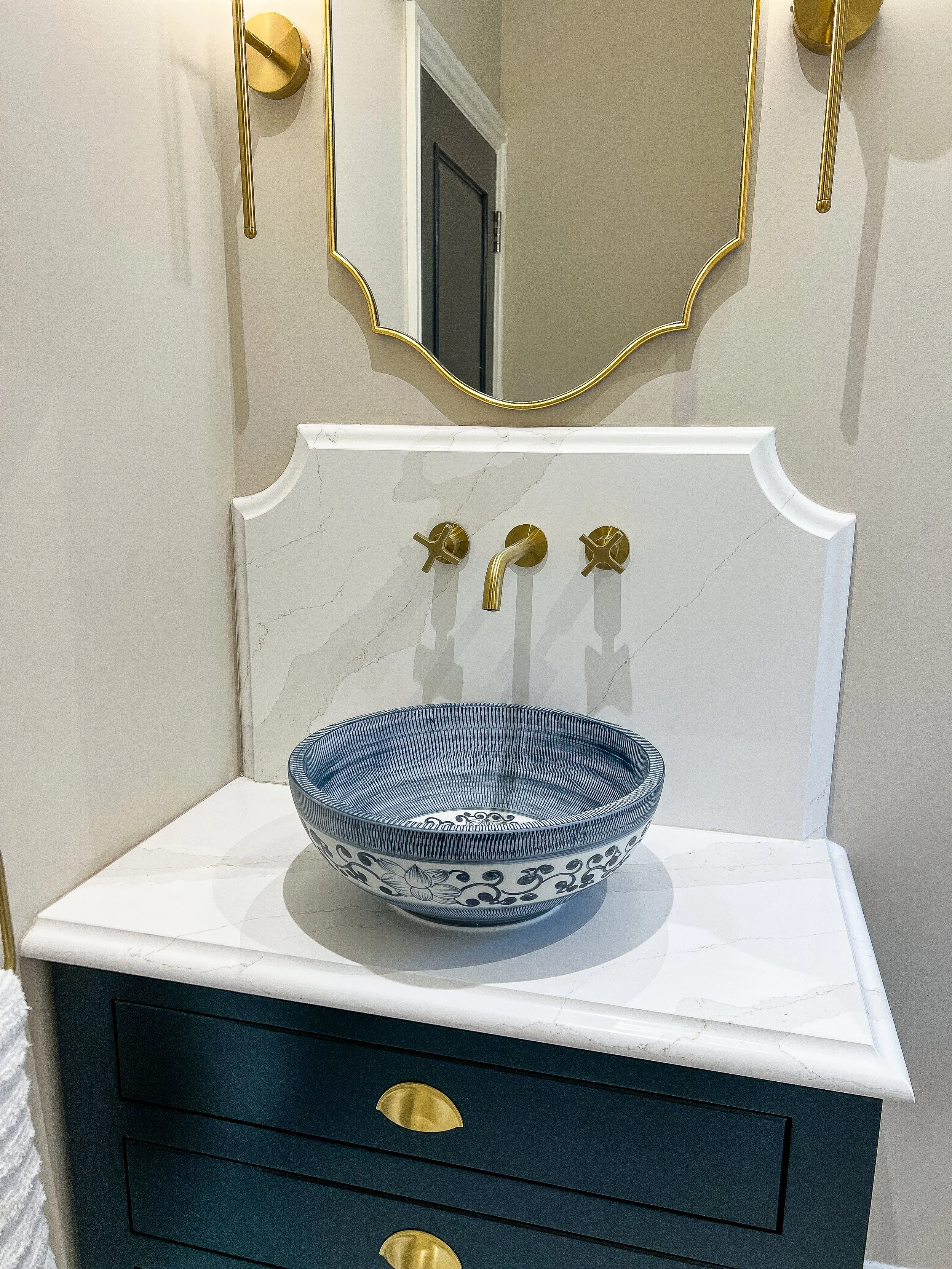 The combination of white and blue evokes a sense of serenity and freshness. Brushed brass brassware complements the coolness of the blue and white palette, adding a touch of luxury and warmth to the overall ambience.