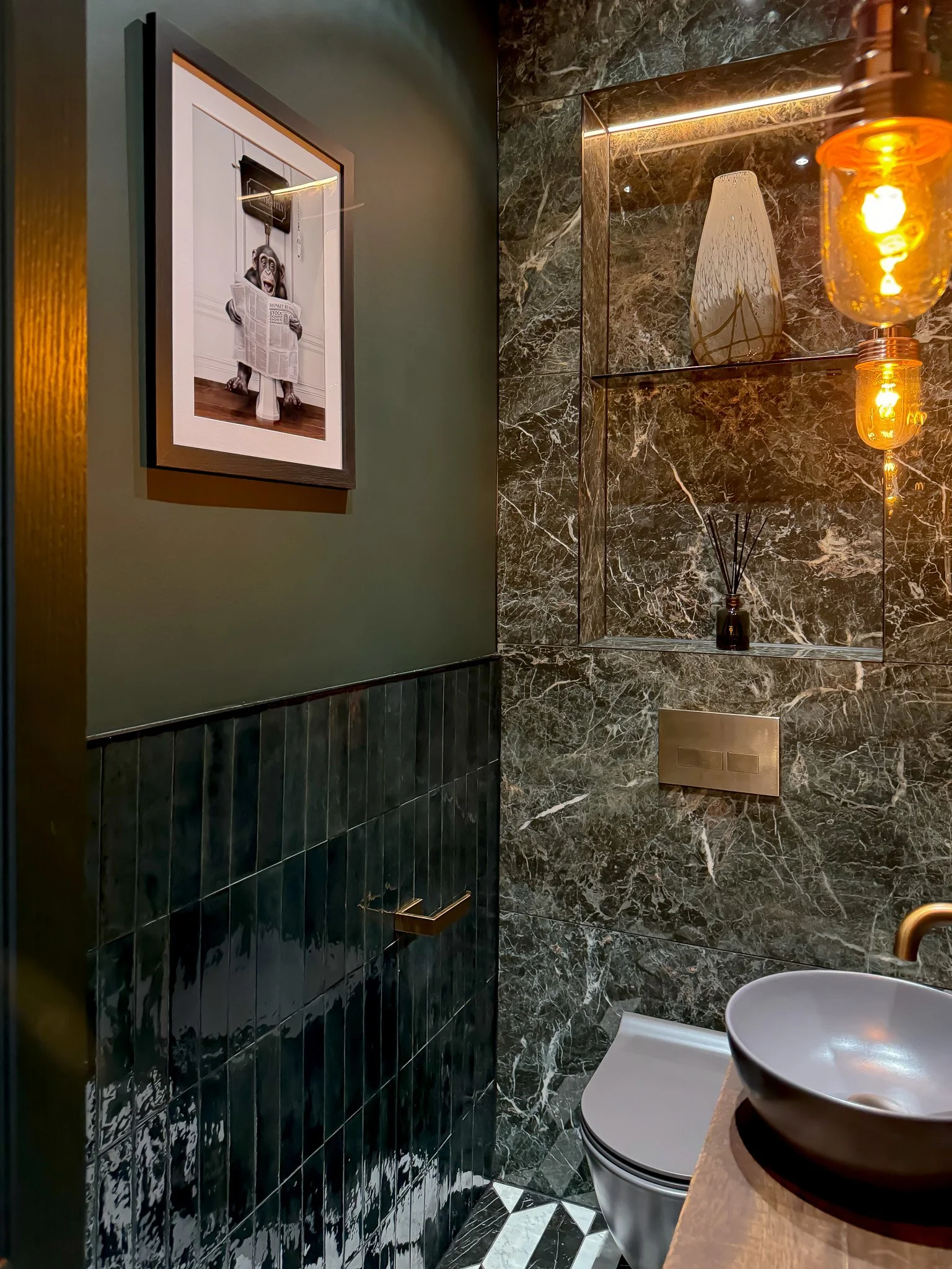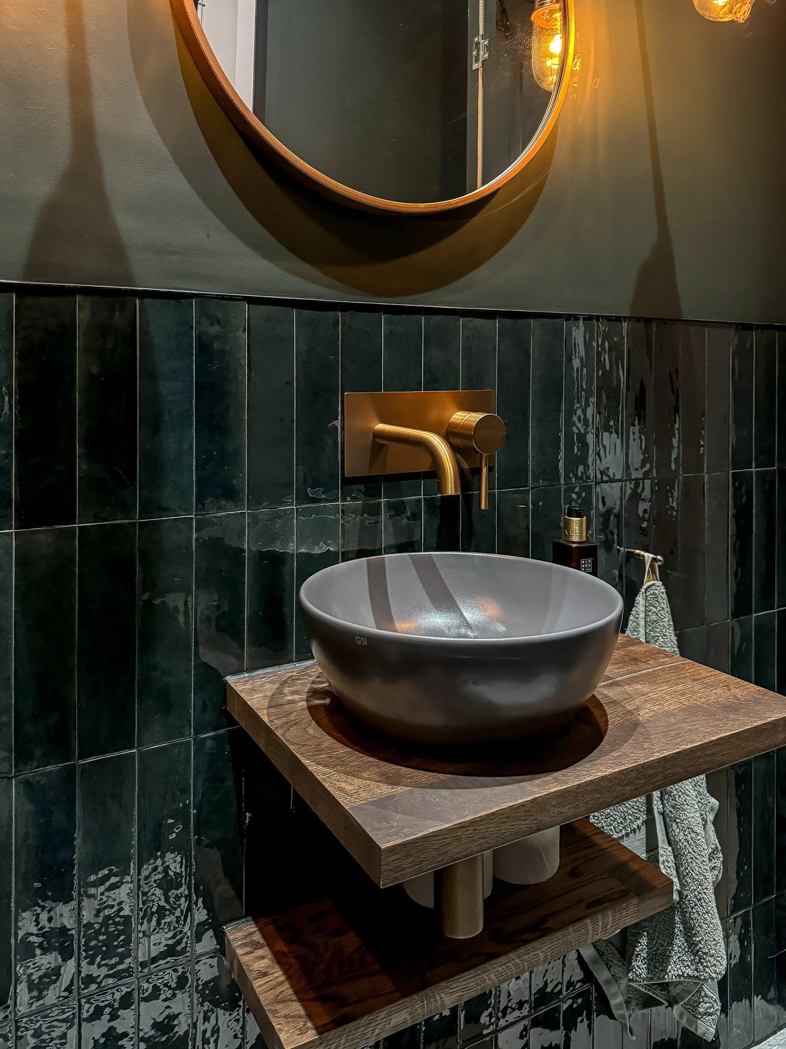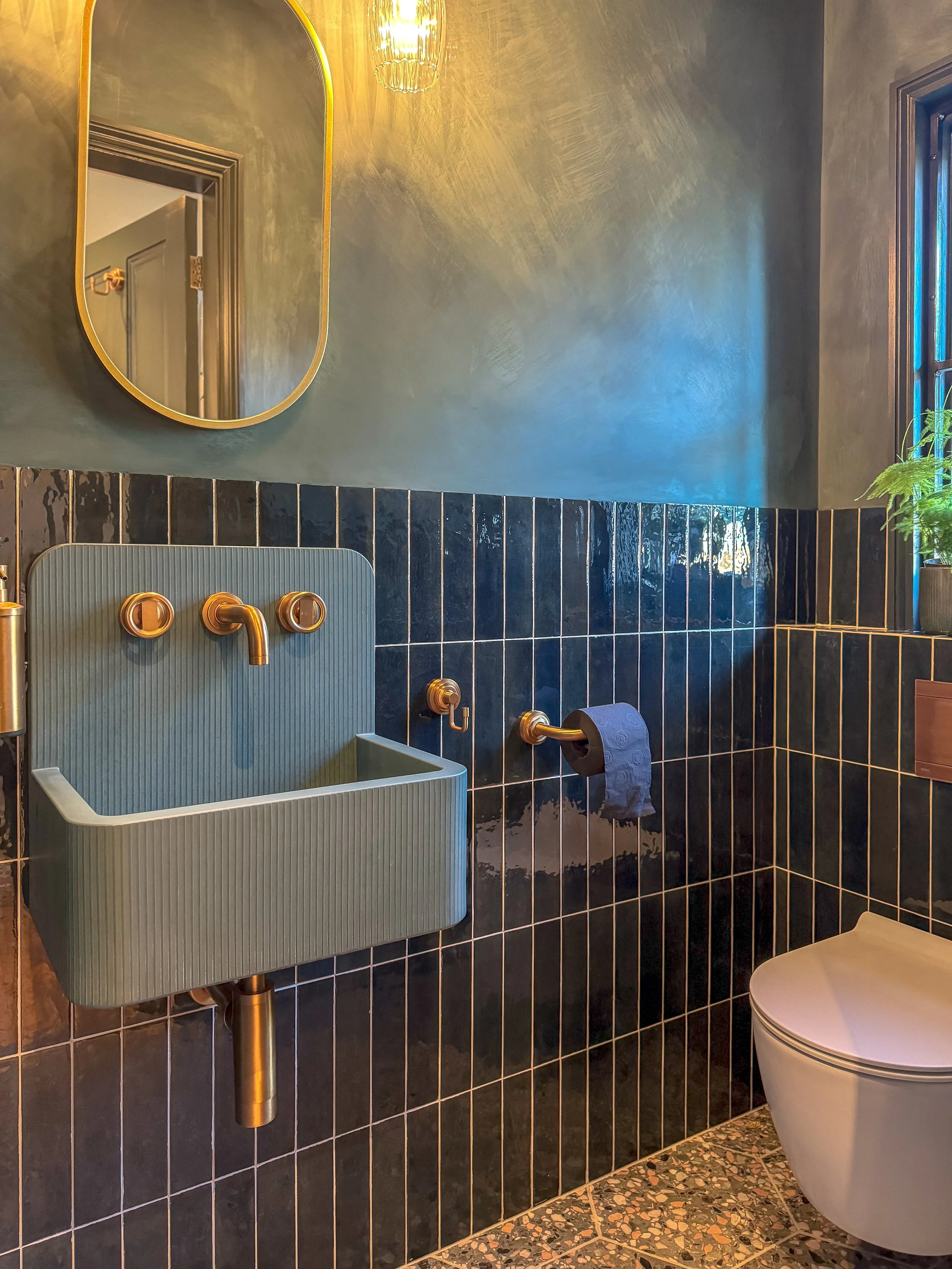 A cloakroom full of personality with a green deep tone, creating a moody, dramatic vibe while the Brushed bronze accessories give it a vintage feel.
