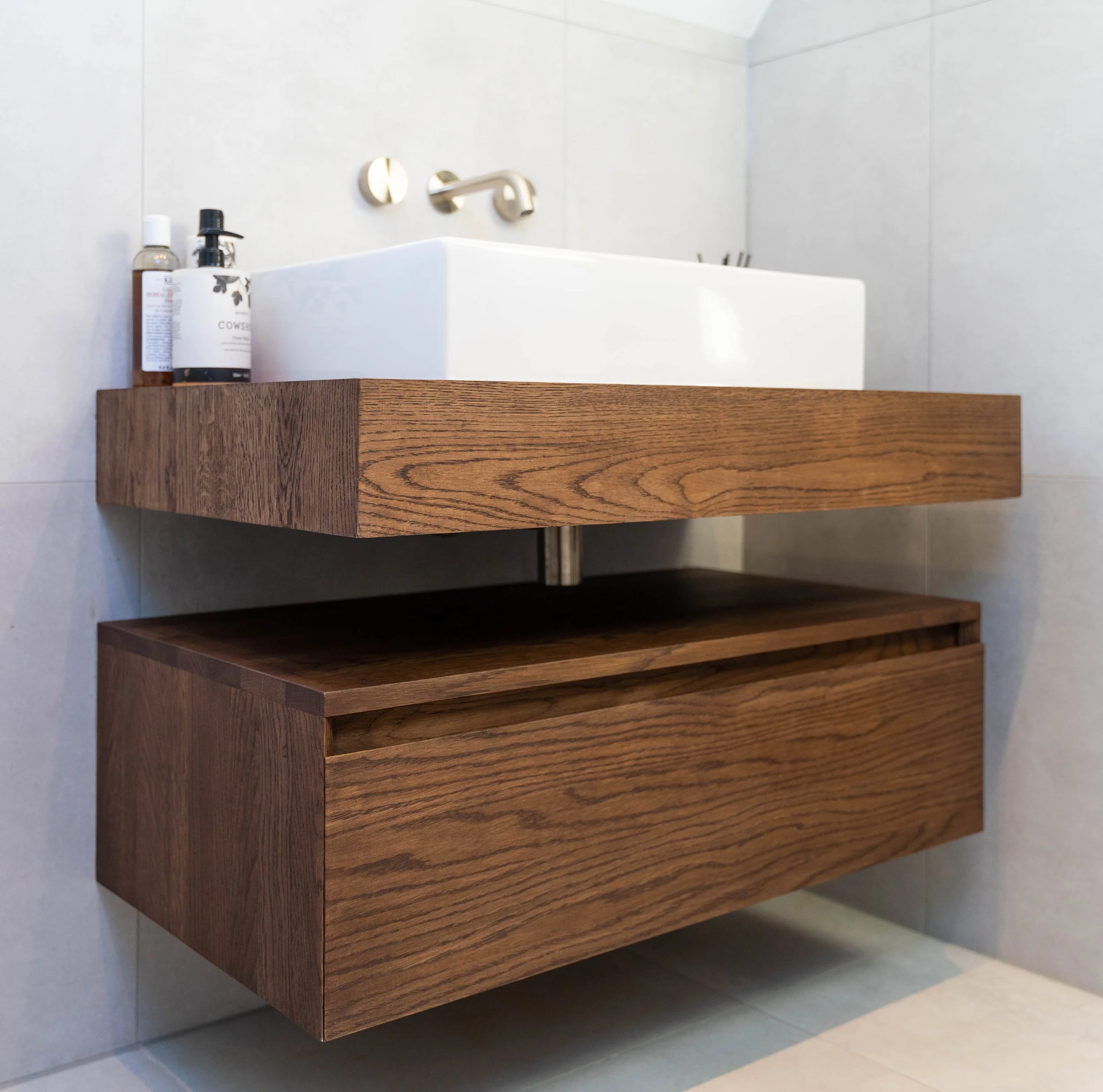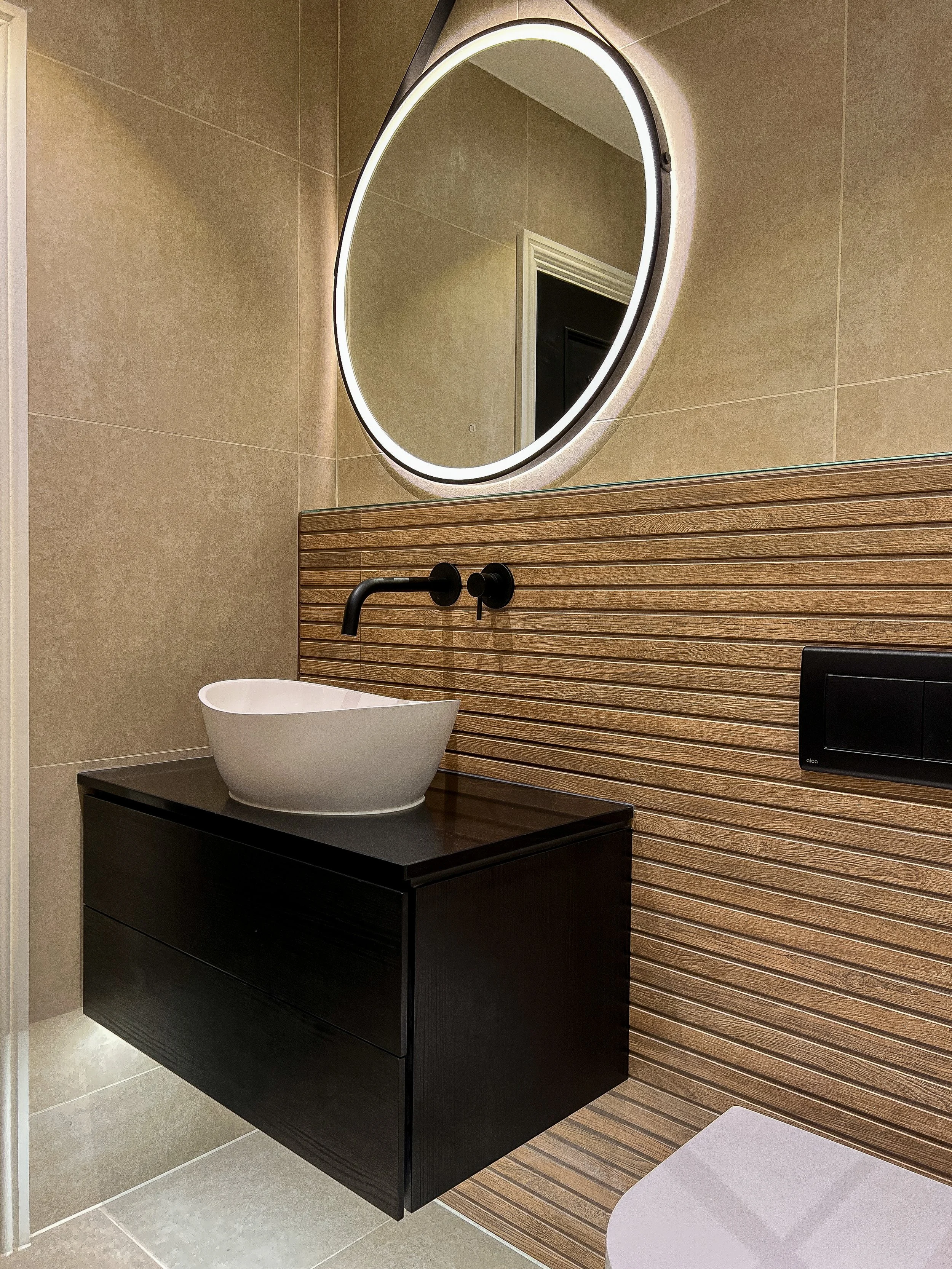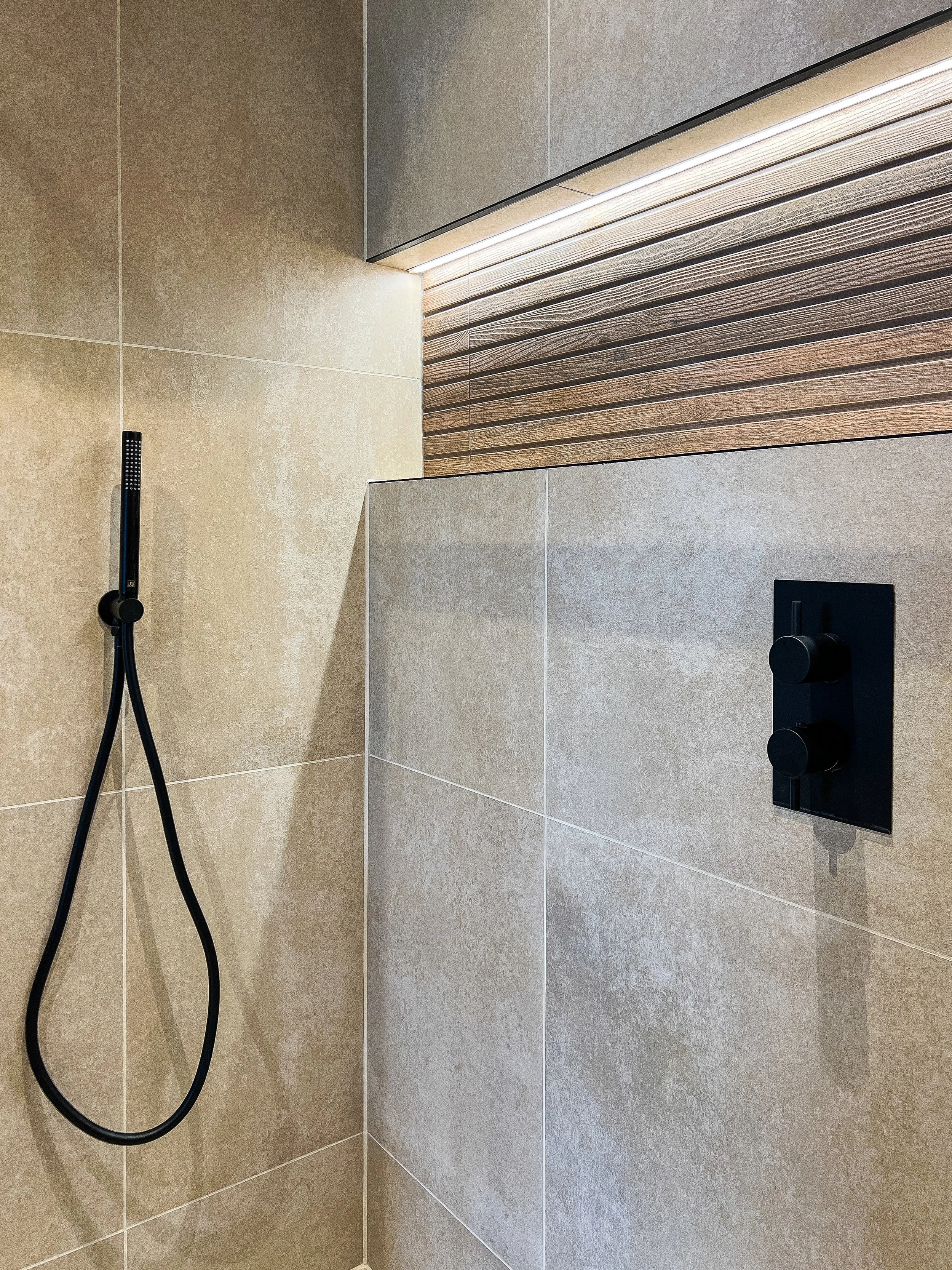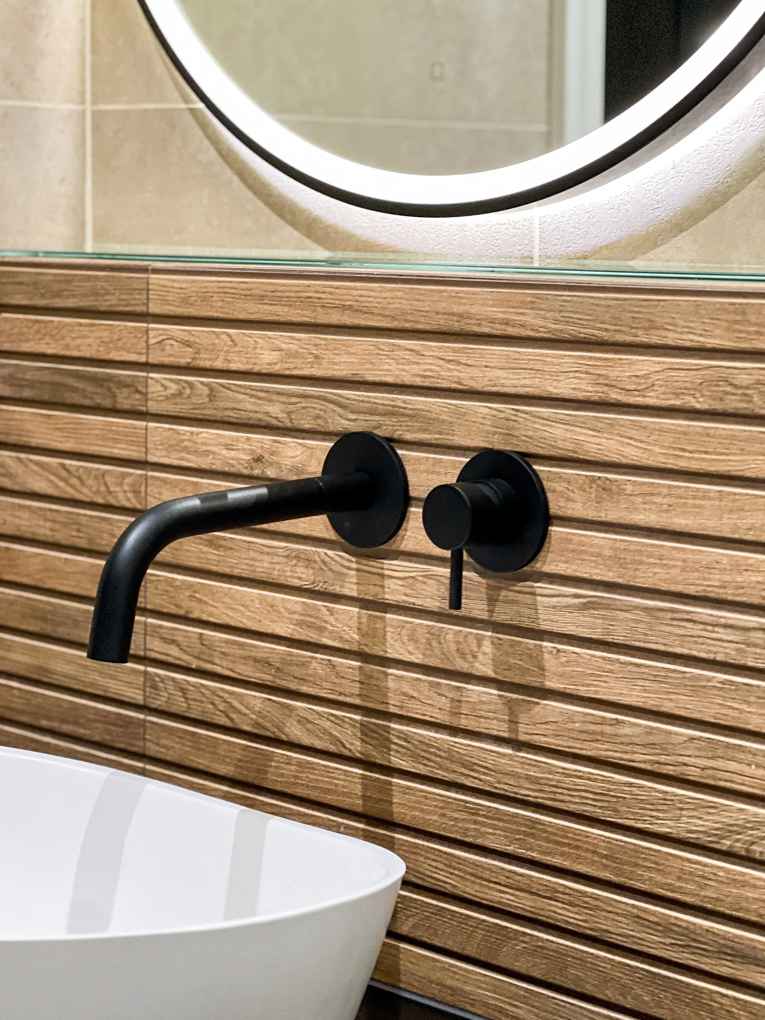 Wooden effect tiles in a bathroom present a modern and inviting aesthetic. Complemented by the soft elegance of beige-coloured tiles and matt black brassware. The combination exudes a sense of tranquillity and sophistication enhancing the overall sleekness of the design.