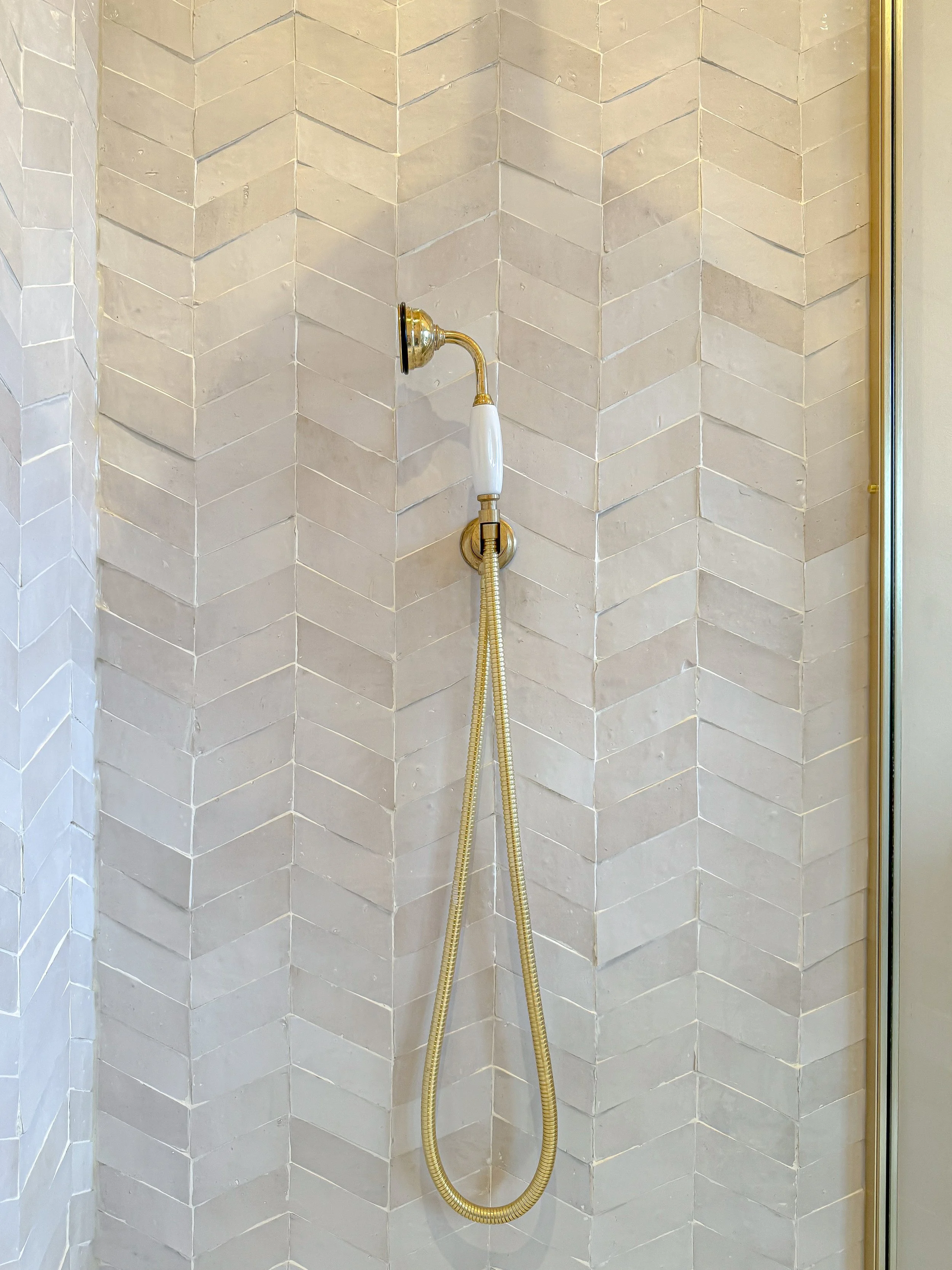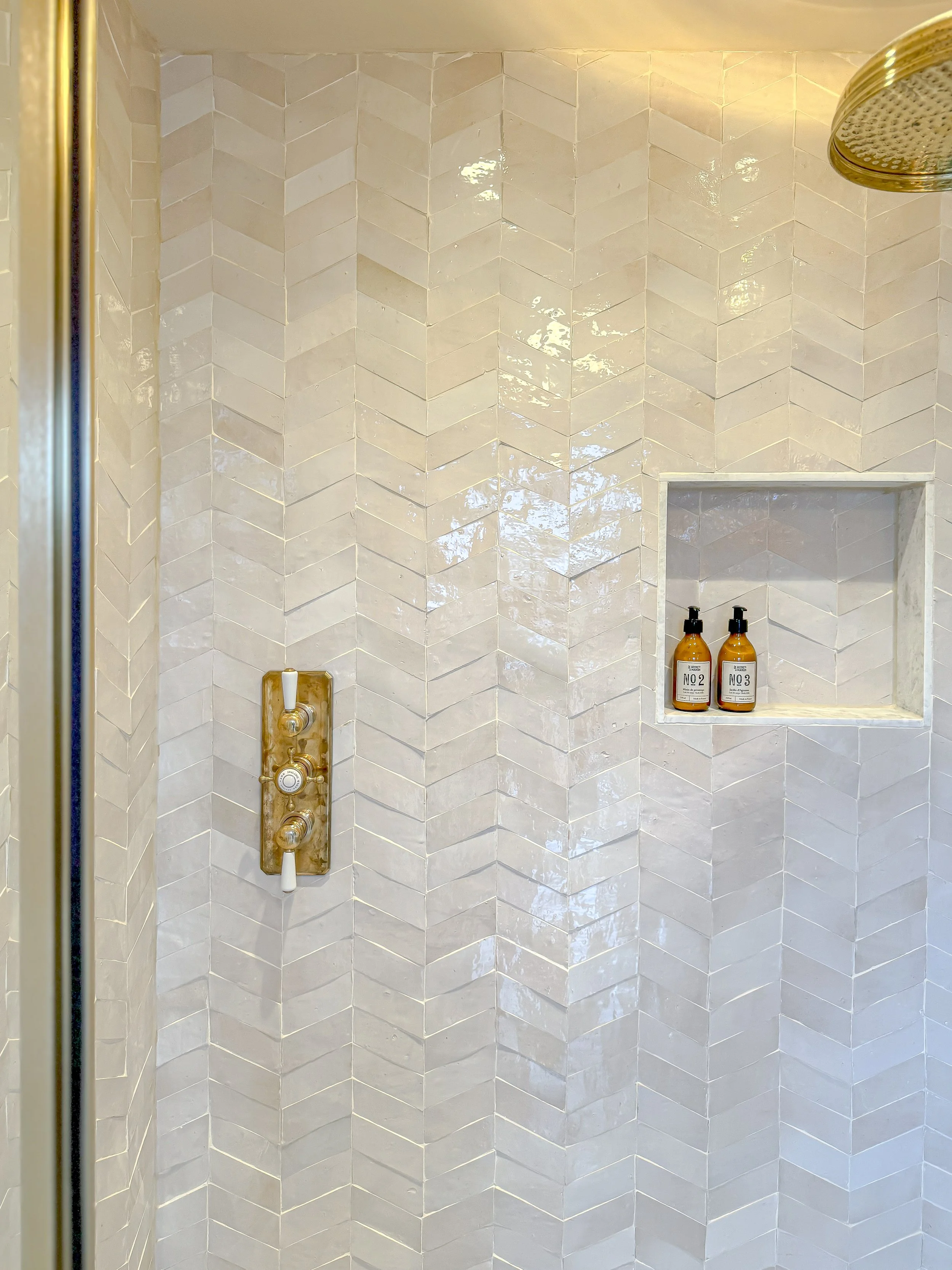 The soft, neutral hues of the tiles create a serene and sophisticated backdrop, while the textured finish adds depth and visual interest. Paired with gold brassware, together these elements create a harmonious and inviting atmosphere.