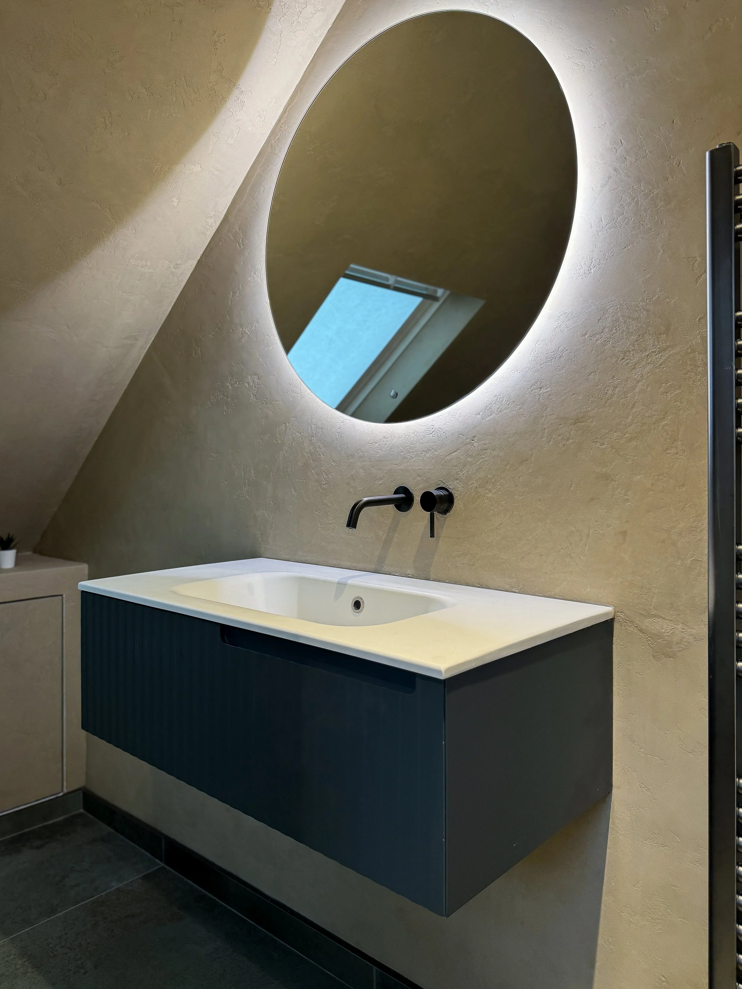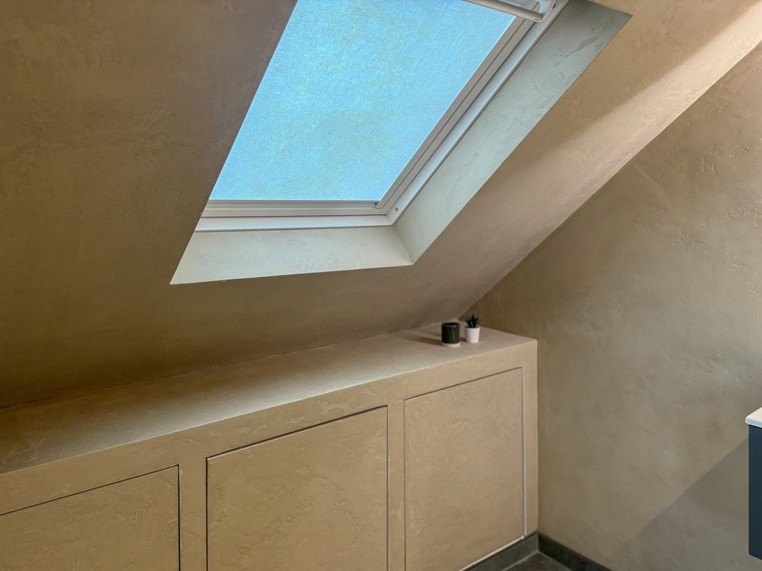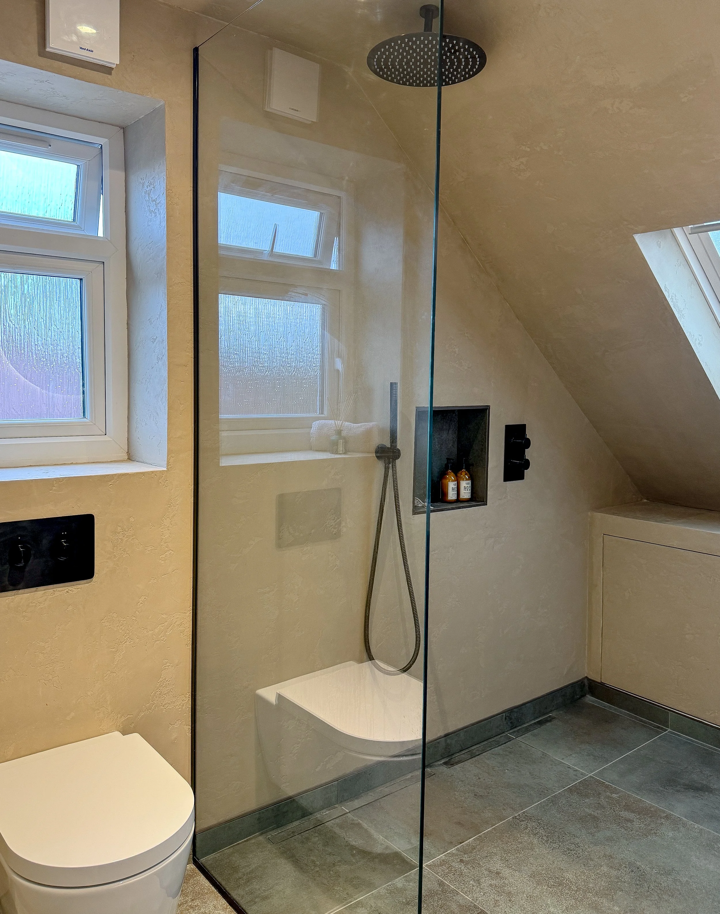 The subtle richness of the beige tone microcement offers warmth and modernity while providing a sense of spaciousness. Paired with sleek black brassware, creating an atmosphere of understated luxury and timeless appeal, elevating the ensuite shower room into a stylish sanctuary.