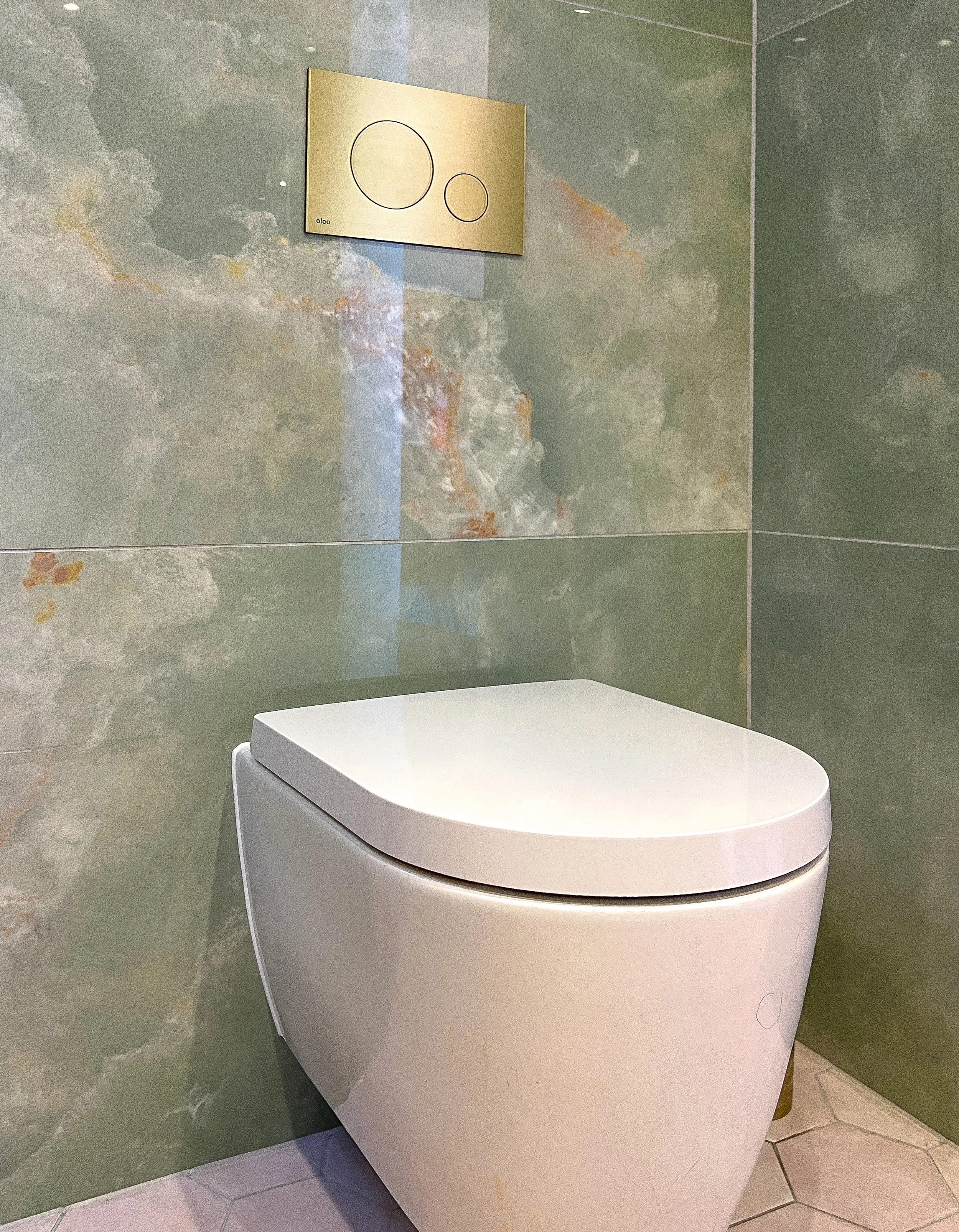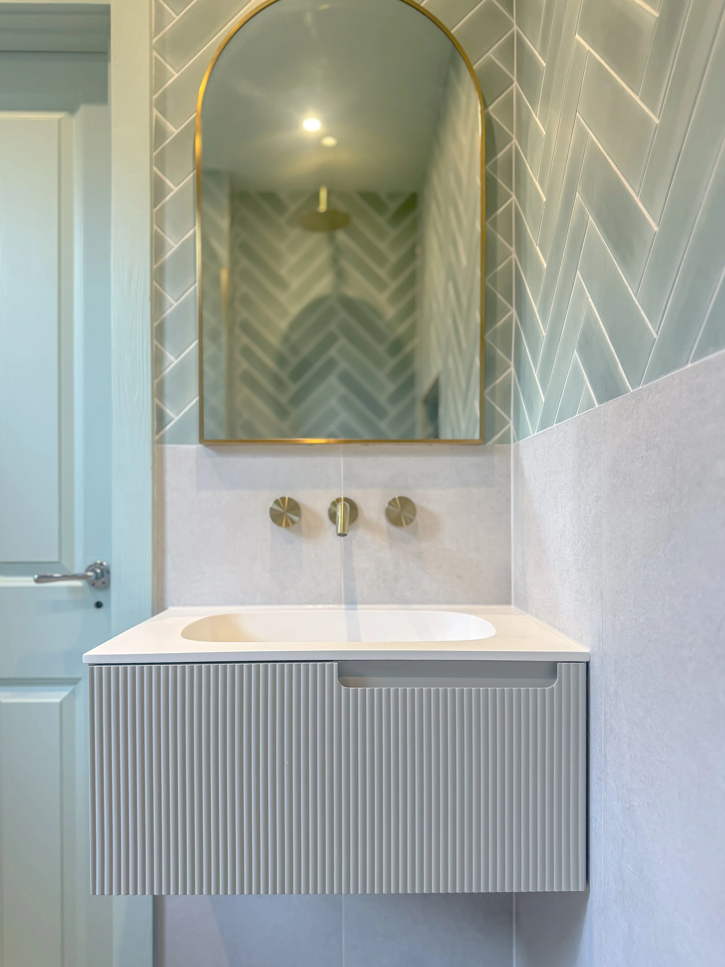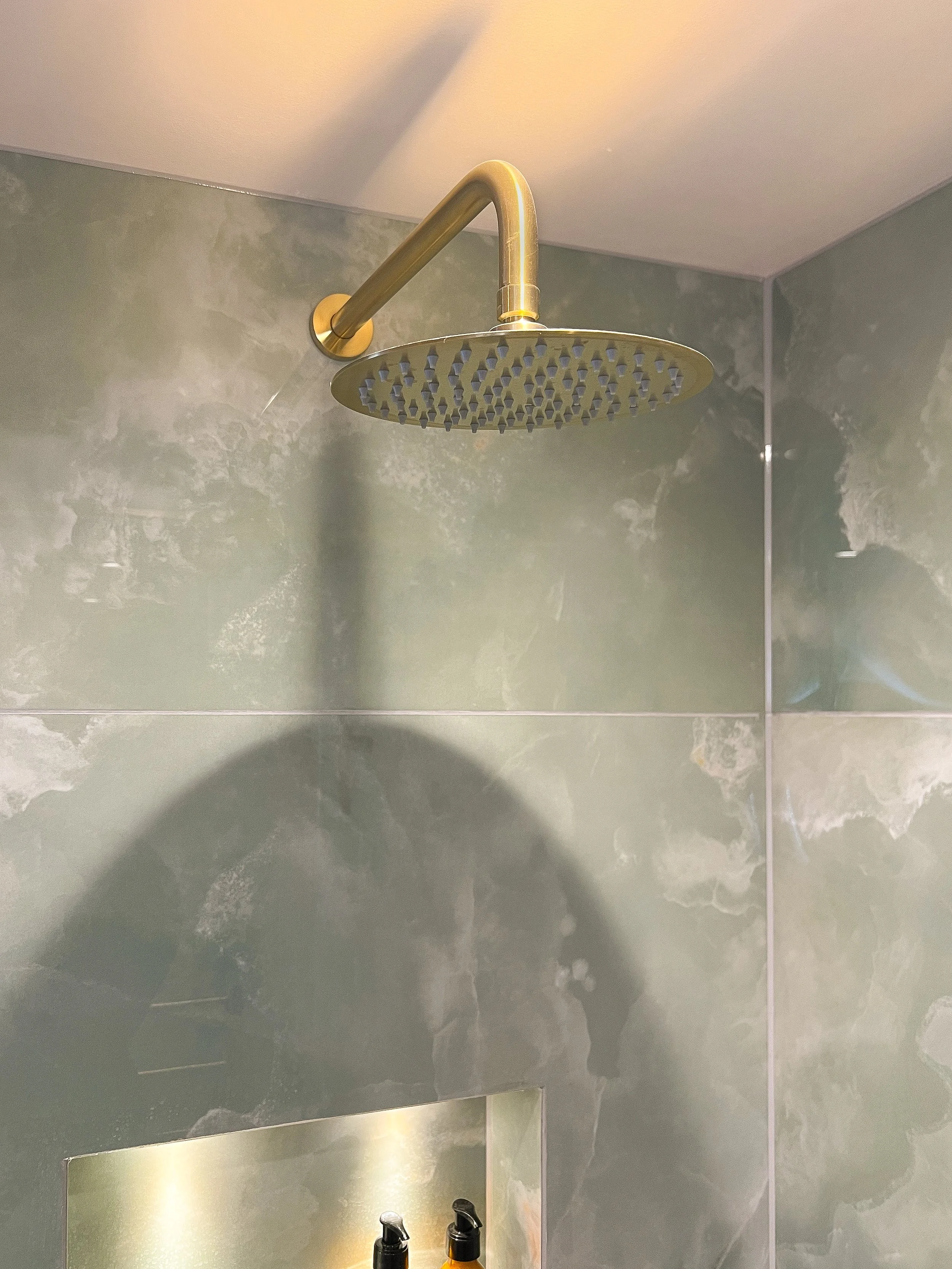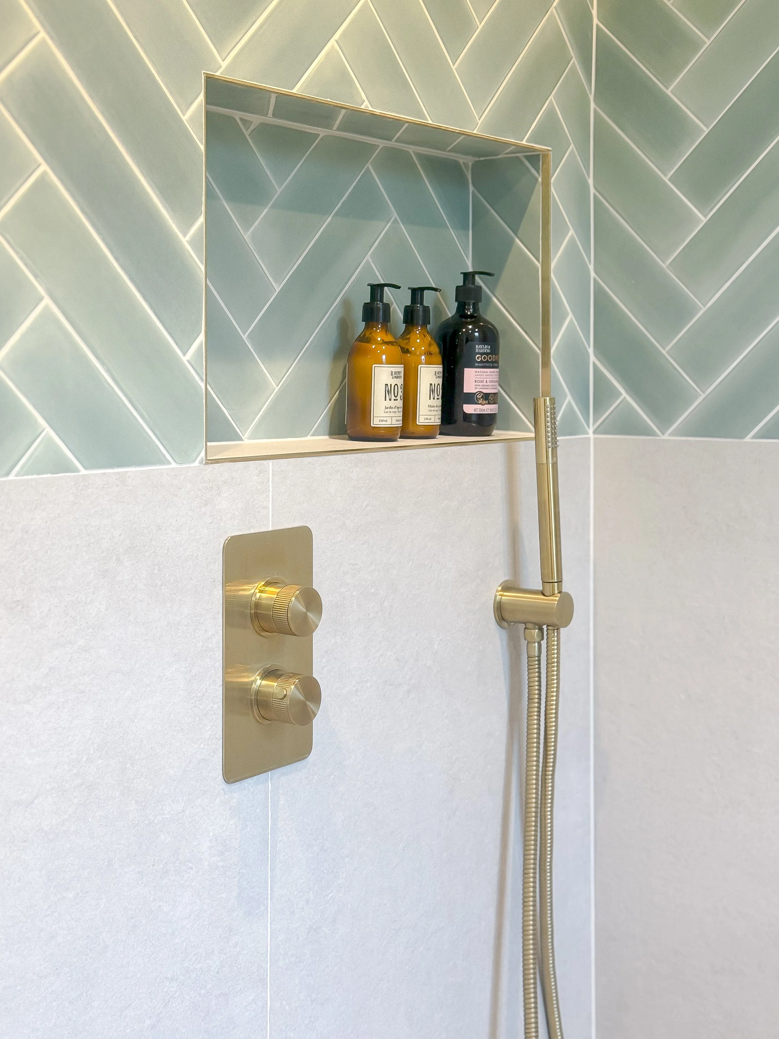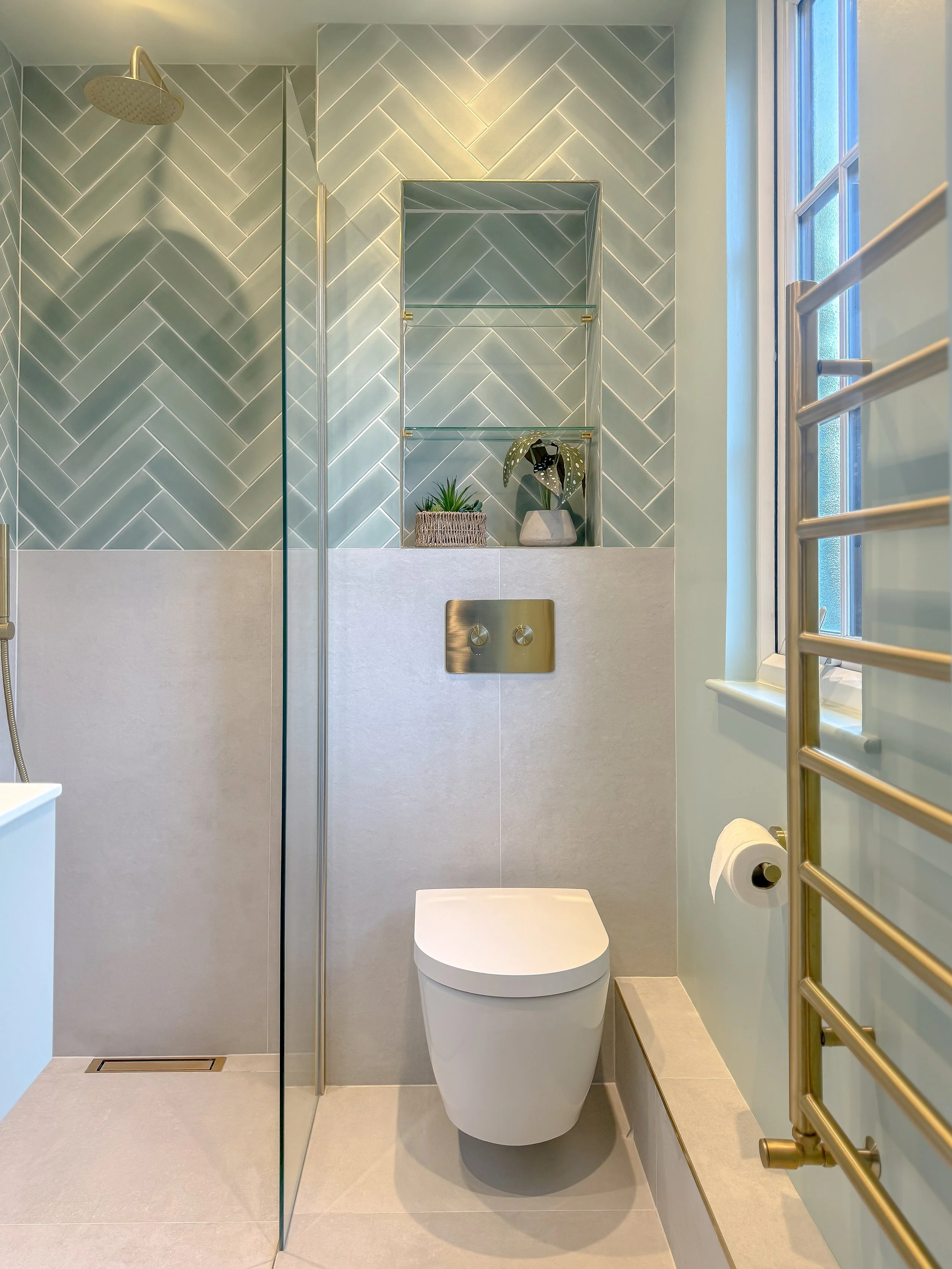 The aqua hue of the tiles evokes a sense of tranquillity and freshness, enhancing the bathroom's atmosphere with a soothing touch of colour. Paired with brushed brass brassware, the design achieves a striking contrast between the cool tones and warm elegance.
