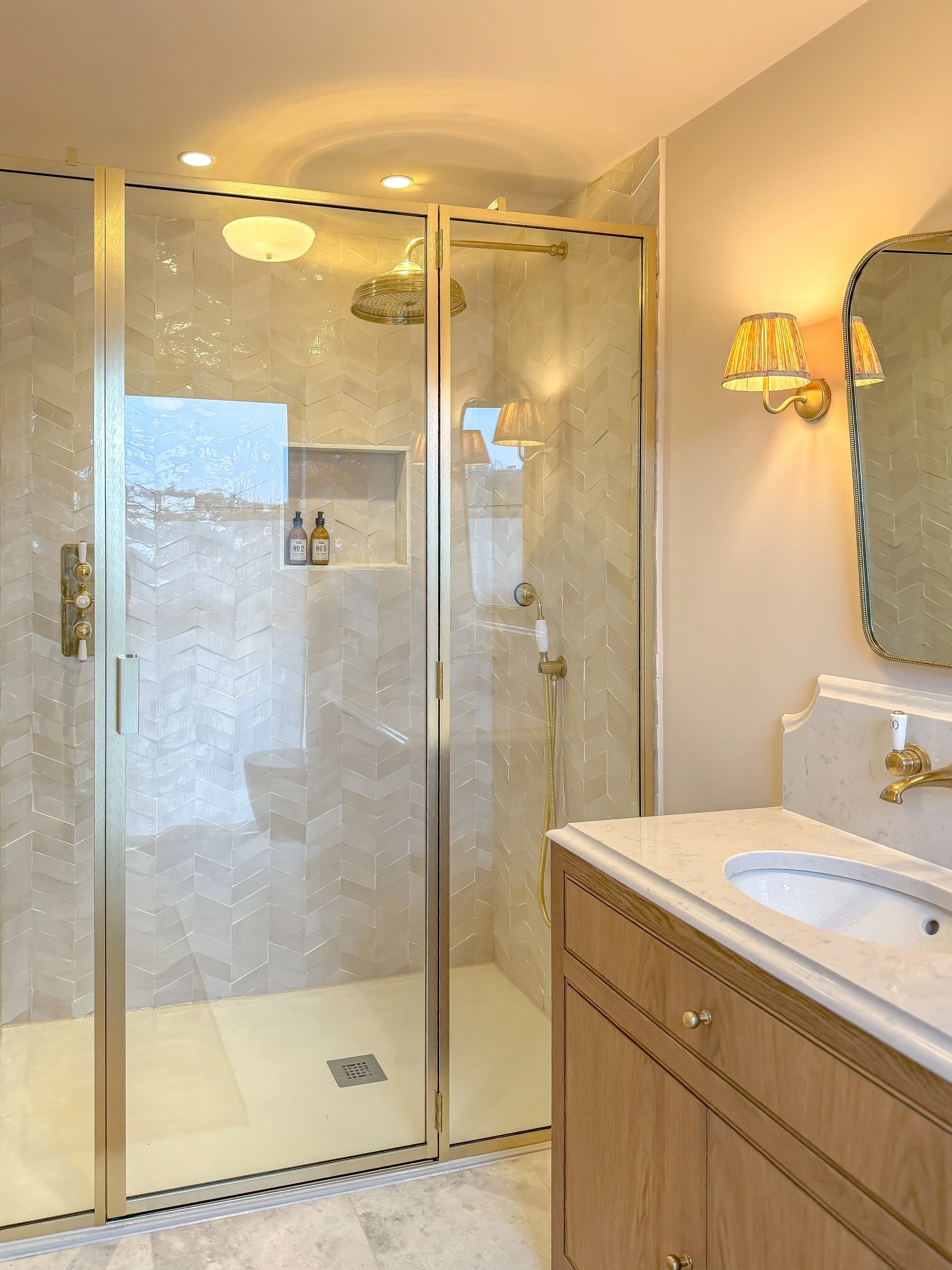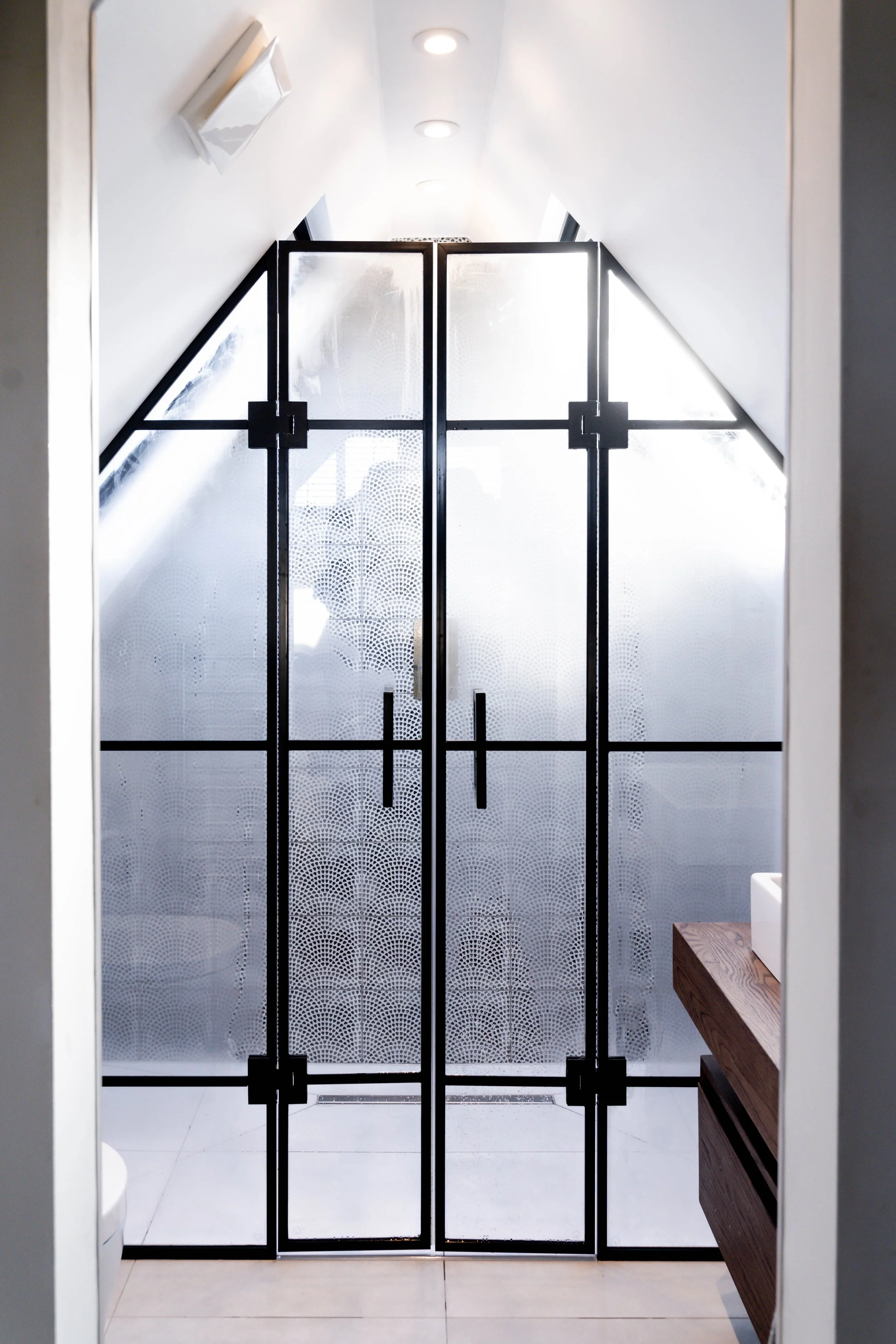The distinctive grid design of the Crittall-style enclosure adds a touch of architectural interest, creating a stylish focal point while maintaining an open and airy feel. Complemented by nickel brassware, the combination exudes sophistication and modernity, enhancing the overall aesthetic of the space.