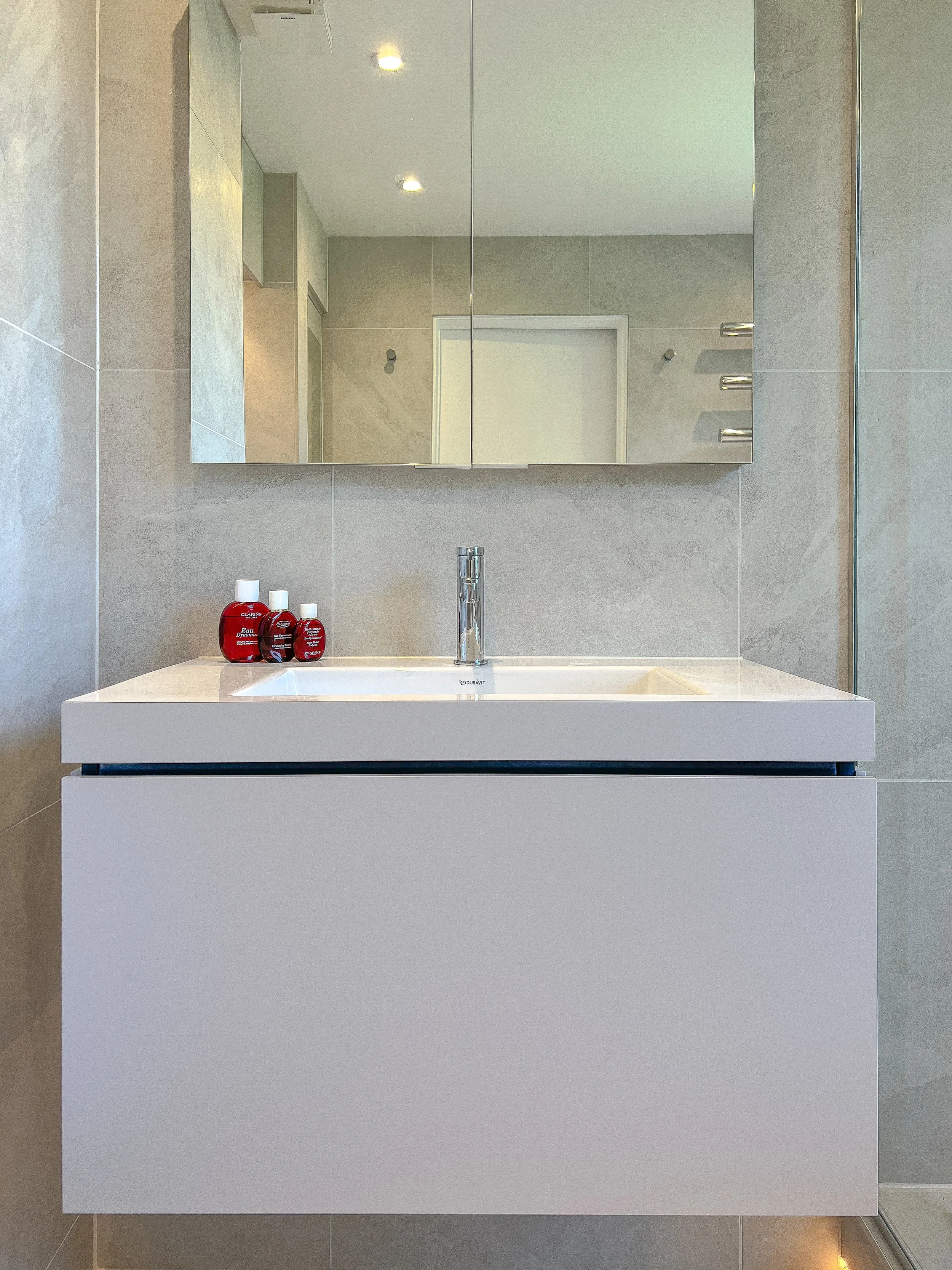 The gentle tone of the light grey tiles combined with chrome brassware brings sophistication, enhancing the bathroom's brightness and sense of spaciousness.
