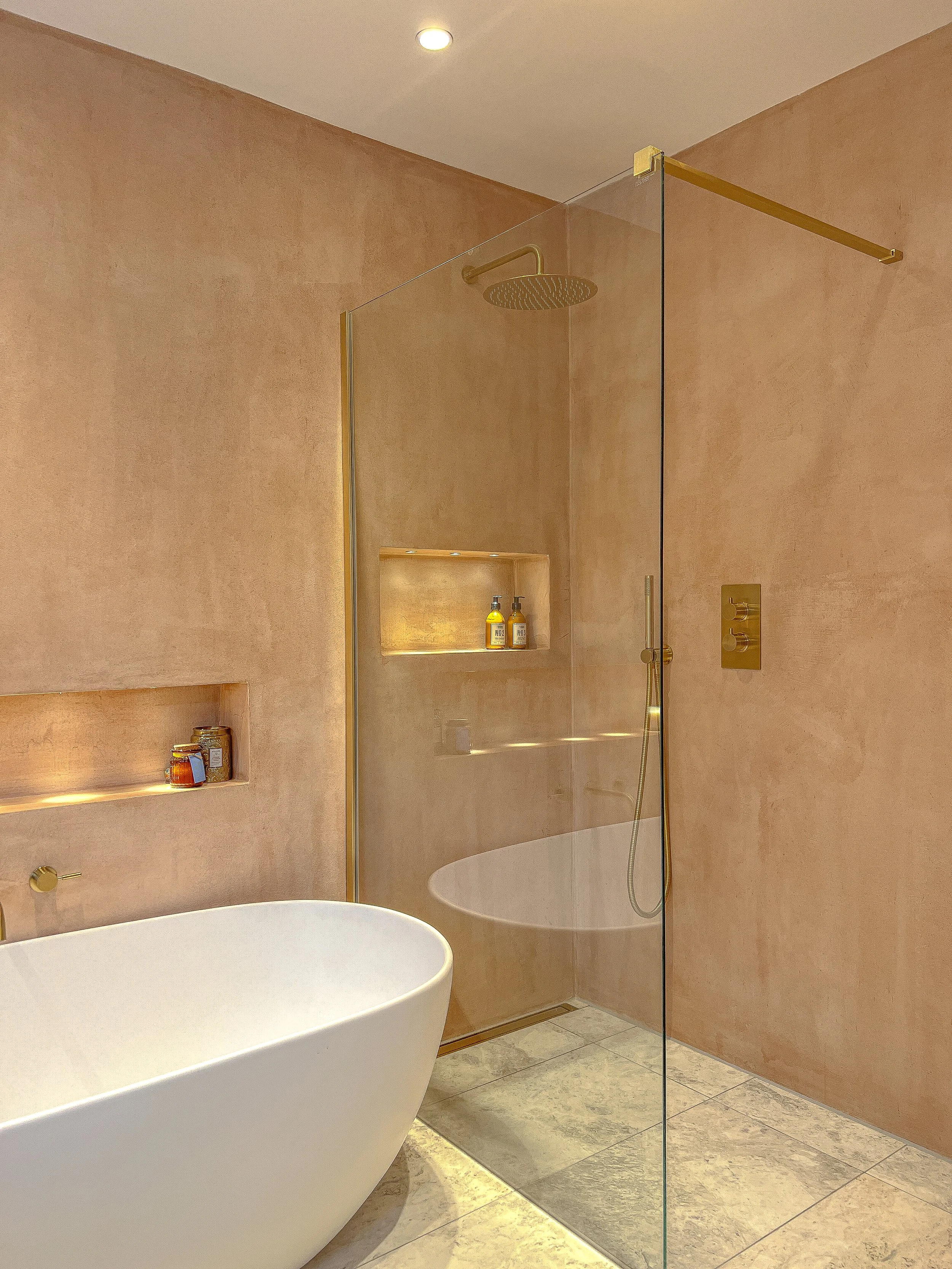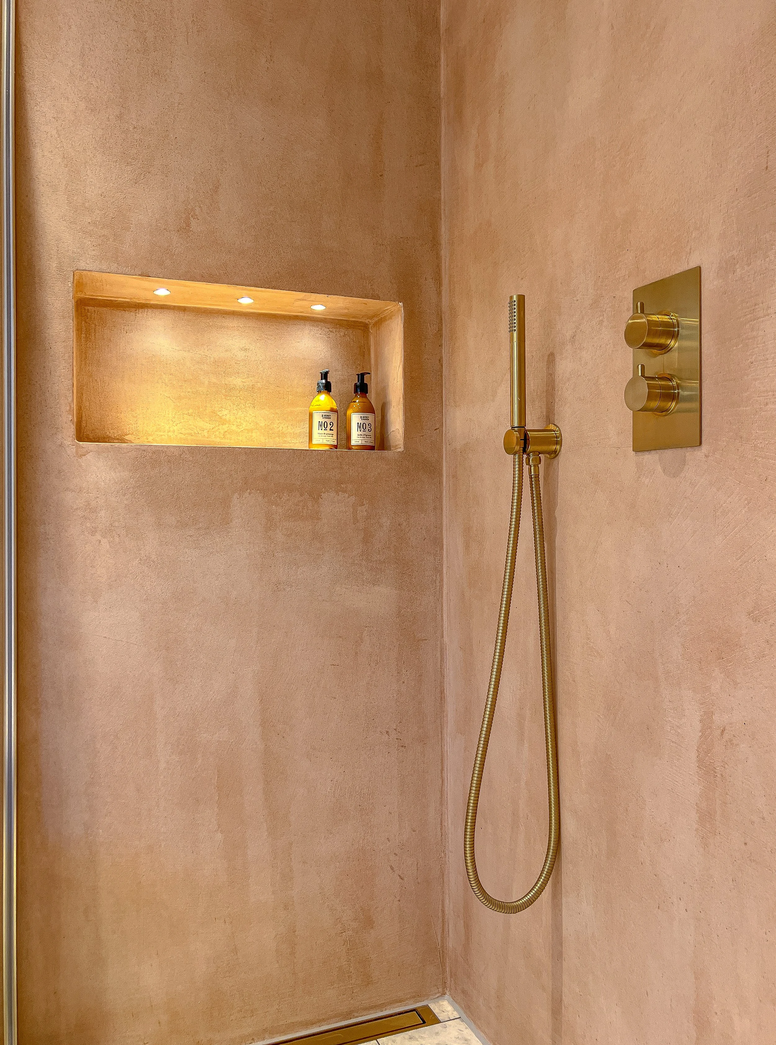 The brushed brass accents add warmth and character while complementing the subtle tones of the rose grey microcement, creating a luxurious and inviting atmosphere in the bathroom retreat.