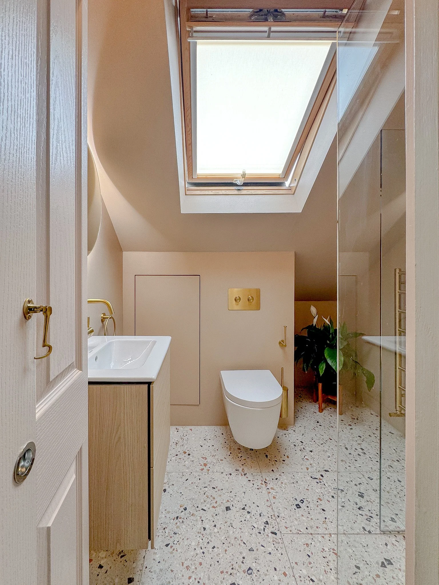 Surface choice sets the tone in a smaller-room scheme. Two approaches work especially well for a modern, design-led look: microcement for a continuous surface, or carefully selected tile where you want crisp edges and pattern.Our microcement bathrooms are defined by a smooth, fully waterproof finish applied in fine layers, which can run across walls and floors for a calm, modern effect: Read our microcement approach. That approach reduces grout lines and supports a seamless appearance, which can be a relief in homes that battle hard-water marks.Tile still has its place, particularly where clients want texture, gloss, or colour. Large-format wall tile can create a cleaner visual rhythm, while floor tiles with a gentle grip suit wet use without feeling harsh underfoot. Tile patterns should be scaled to the room: one feature panel is often enough to add interest without overpowering the space.Terrazzo can add personality and a hint of craftsmanship when paired with simpler surfaces.Microcement and porcelain suit busy homes because they are straightforward to maintain when specified correctly. Sealers, falls, and junction detailing matter as much as the finish itself, so we plan thresholds, drainage, and ventilation early. Underfloor heating also helps surfaces dry faster after showers, which keeps the room feeling fresher with less wiping.Tongue and groove walls can soften the look too, especially for clients who want a cosy, period-friendly feel on a dry wall outside the splash zone.Vanity Planning And Storage Choices Reduce Everyday Mess Without Losing Style